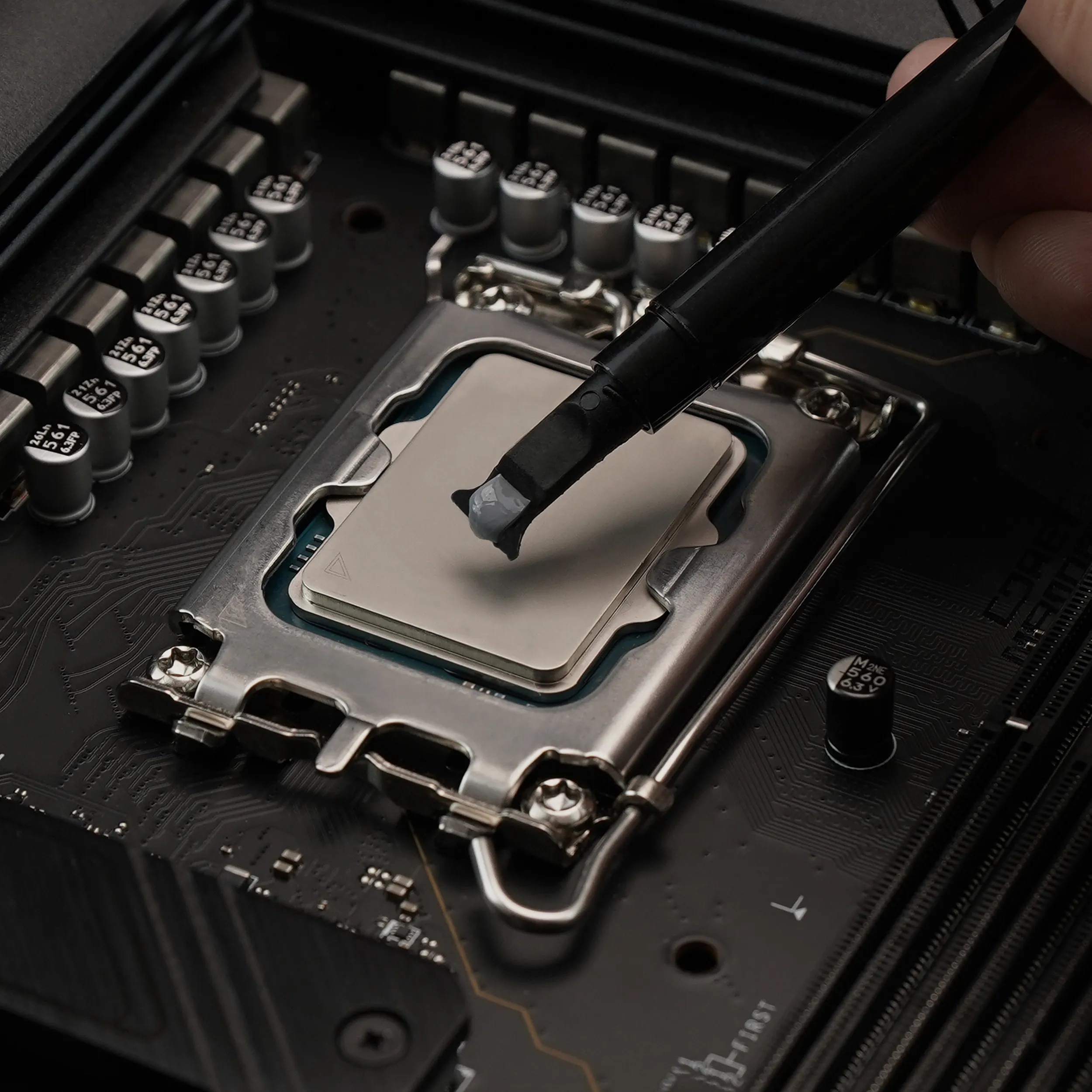 When applying, it is important to spread the thermal paste very slowly. On a typical Intel or AMD CPU, a single spreading motion should take about 3 seconds. The slower the movement, the better the paste can be spread.