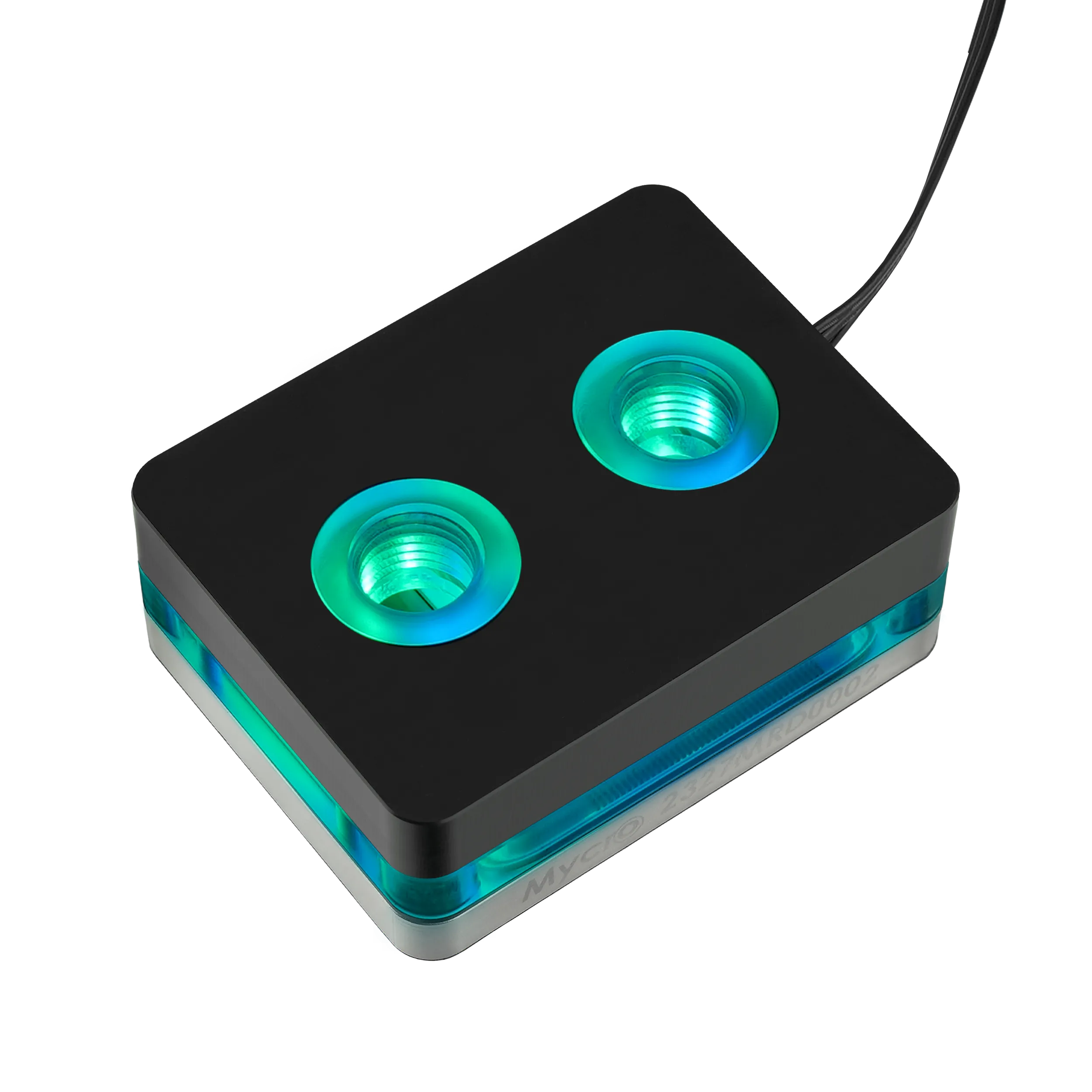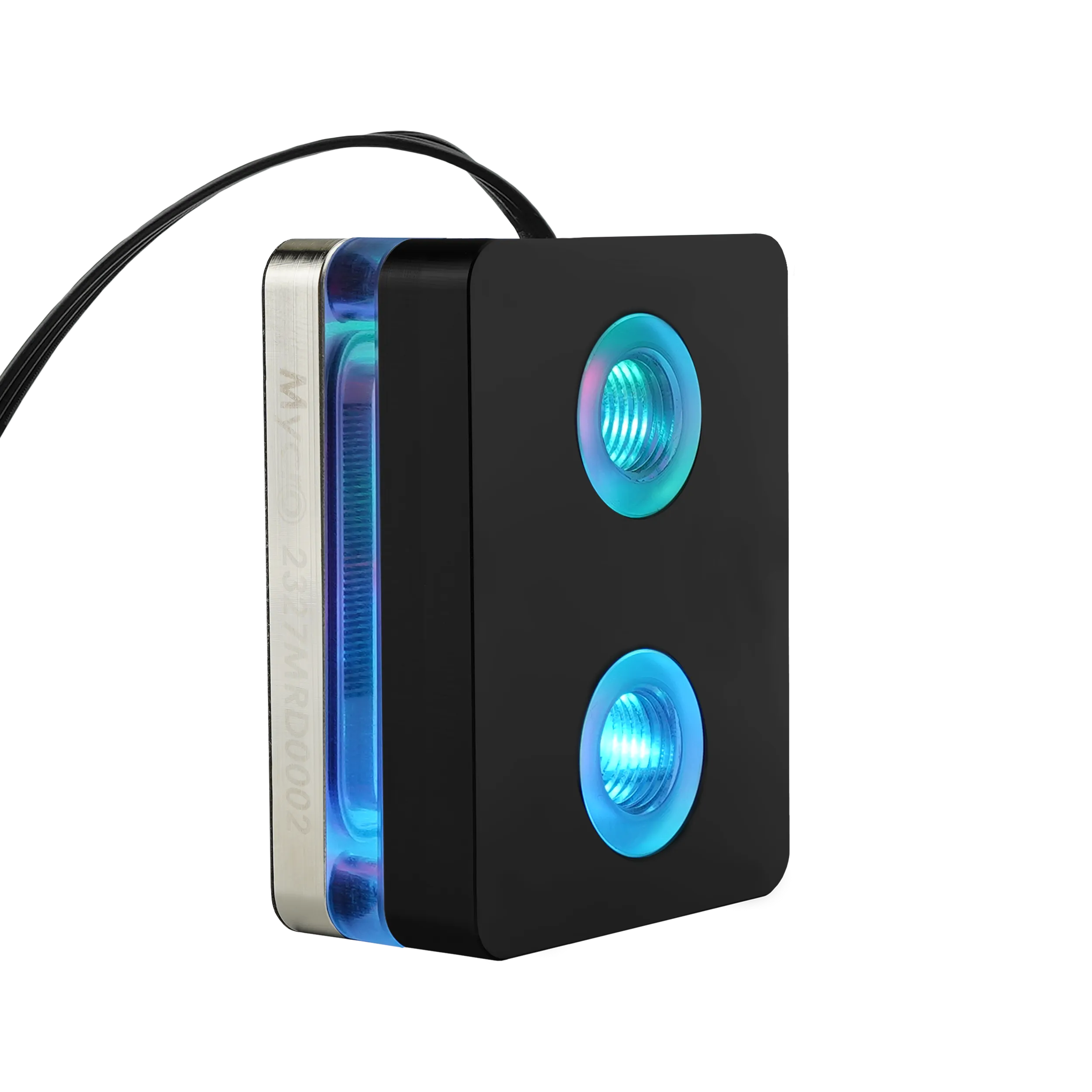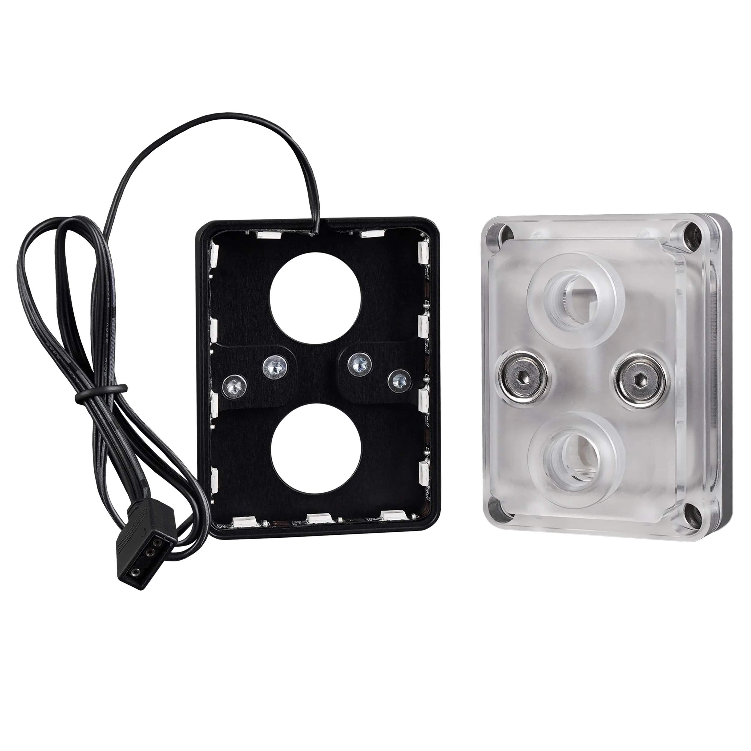 A cover made of anodized aluminum is magnetically attached to this. 13 RGB LEDs integrated into the cover illuminate the side acrylic glass and the G1/4-inch threads. The cover can be mounted so that the RGB connection cable can be routed up or down. The RGB lighting is connected via a 3-pin ARGB header (+5V/DATA/GND).