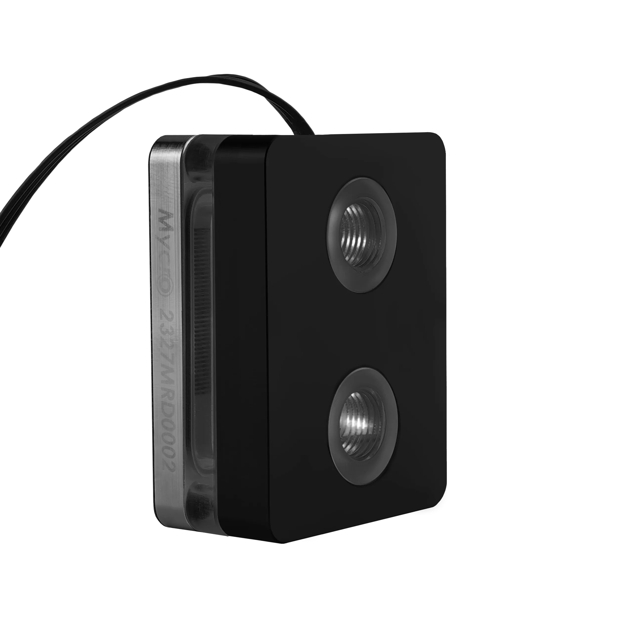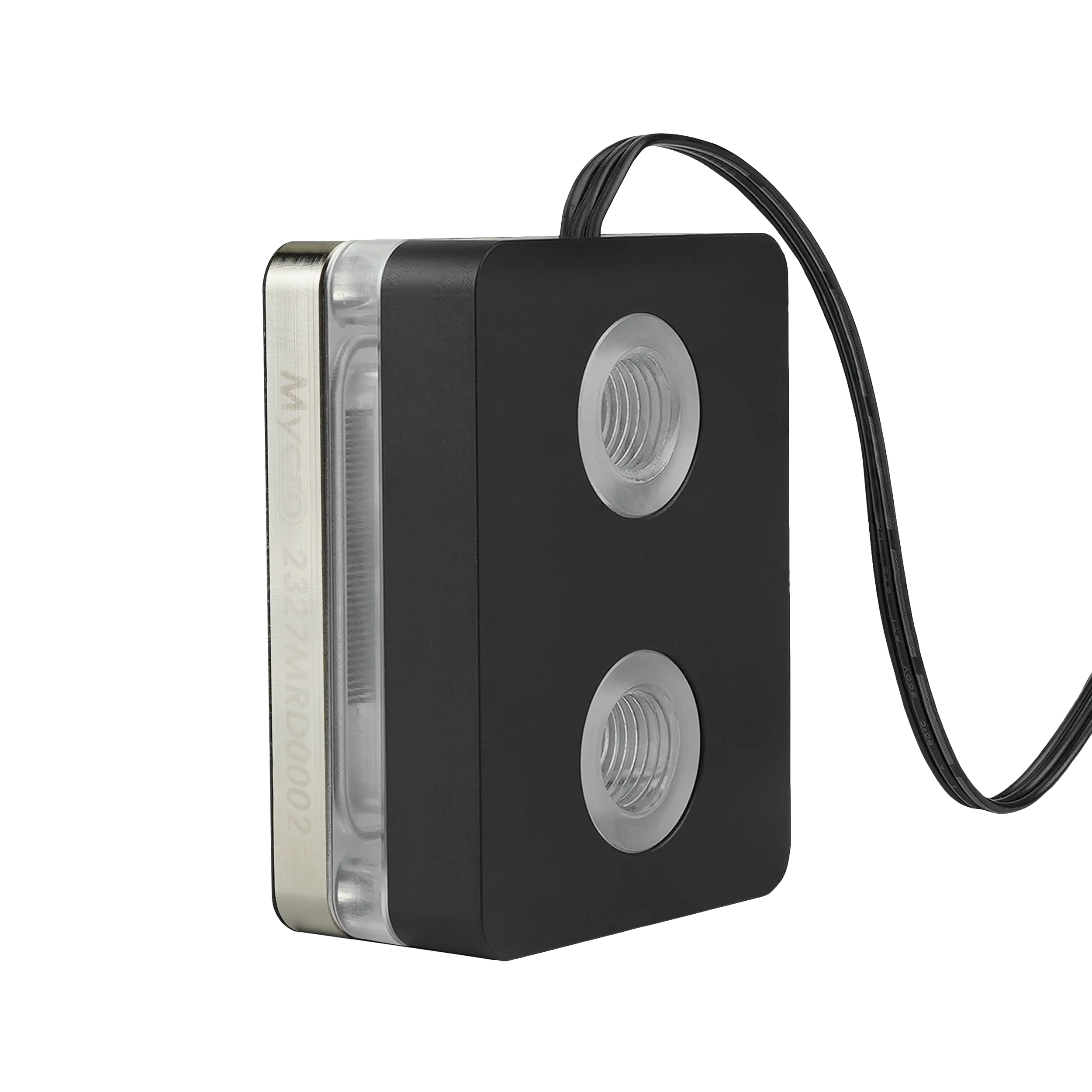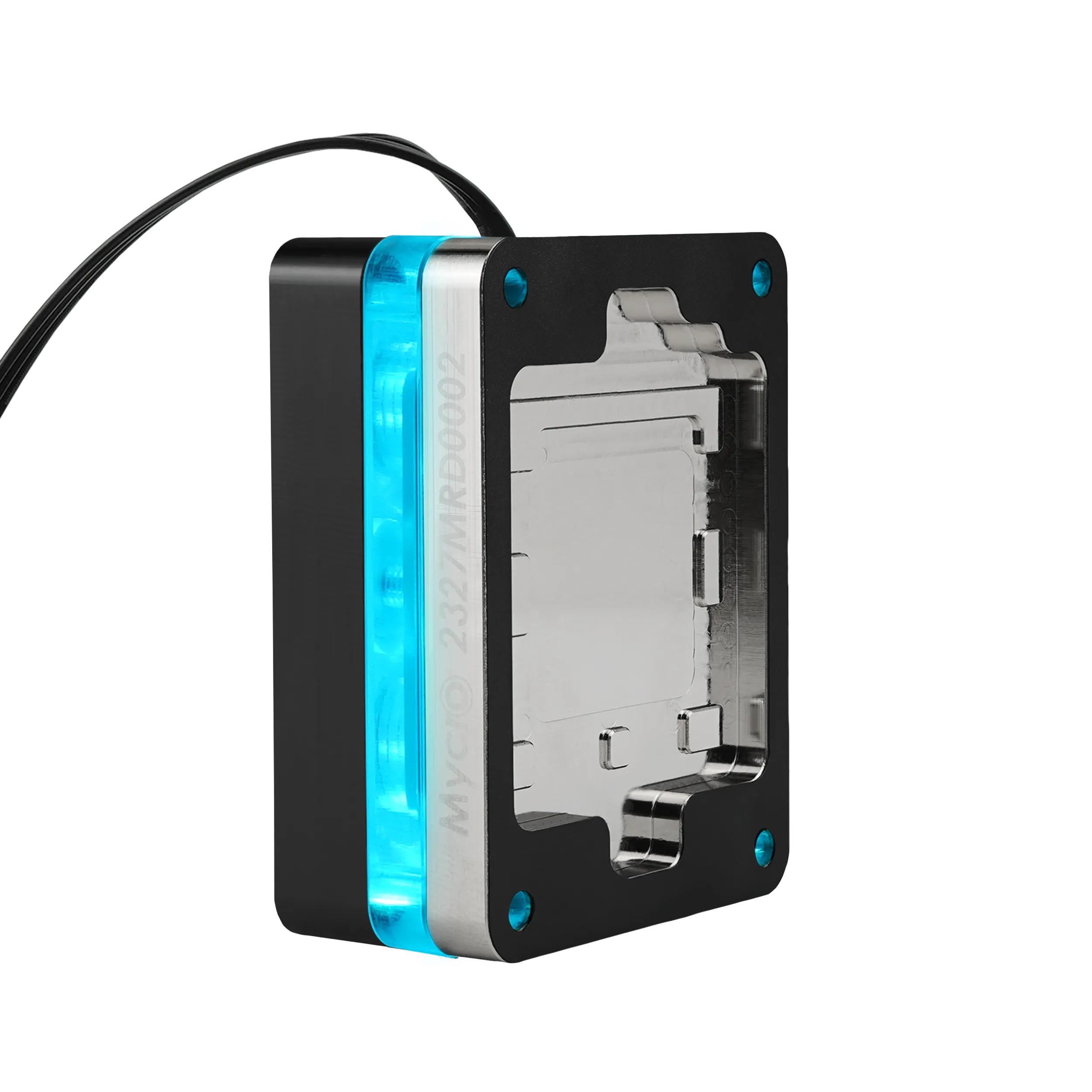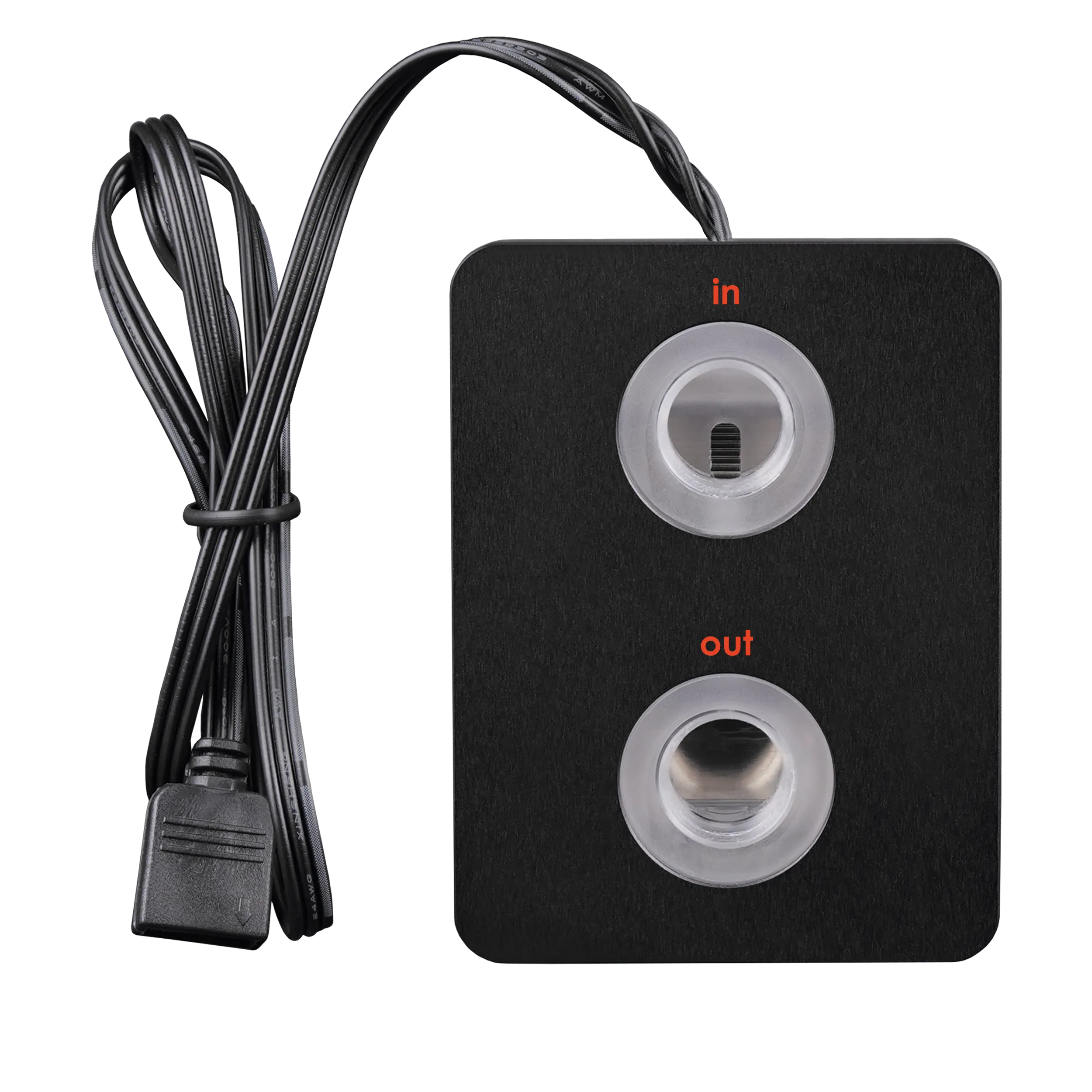 A cover made of anodized aluminum is magnetically attached to this. 13 RGB LEDs integrated into the cover illuminate the side acrylic glass and the G1/4-inch threads. The cover can be mounted so that the RGB connection cable can be routed up or down. The RGB lighting is connected via a 3-pin ARGB header (+5V/DATA/GND).