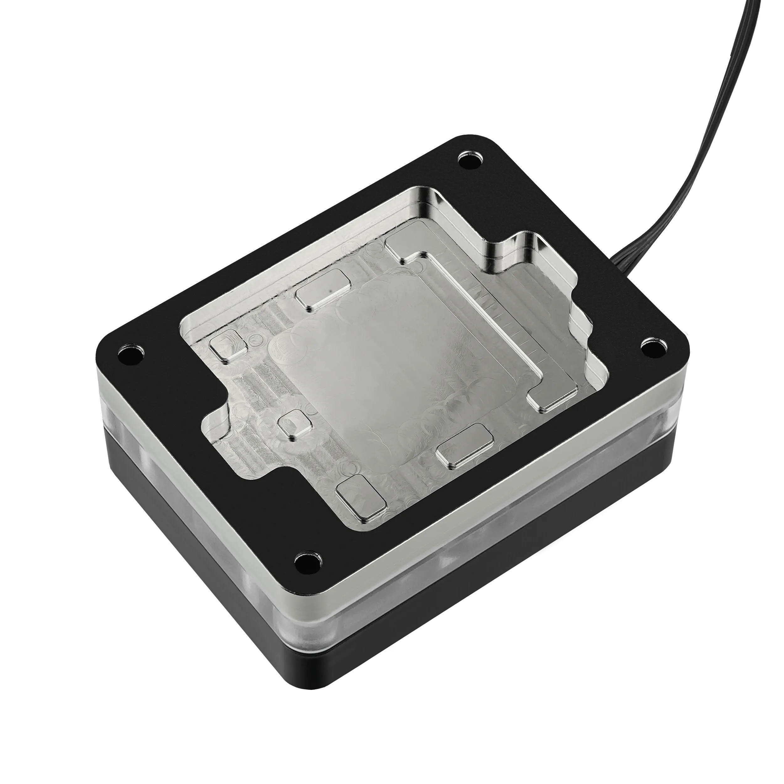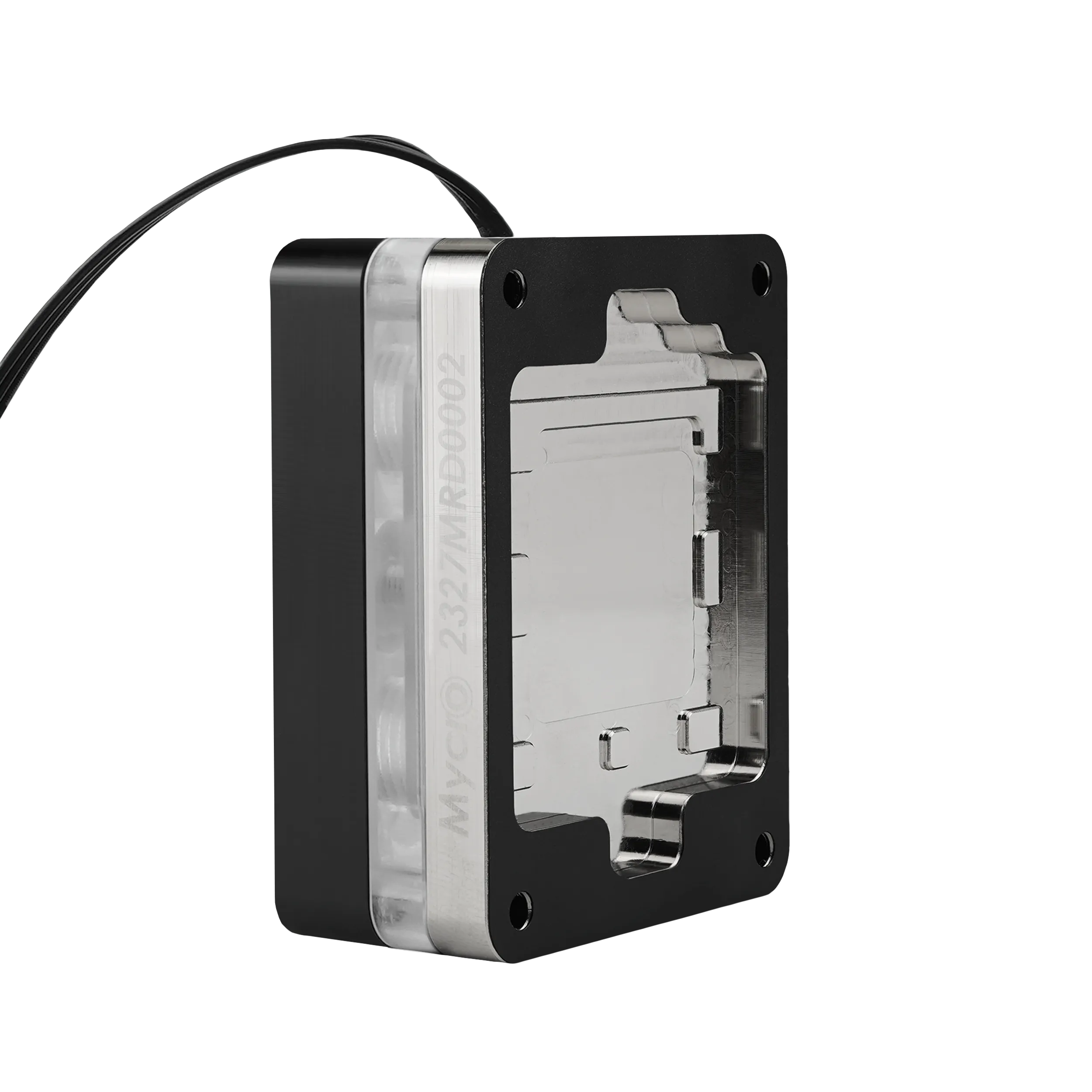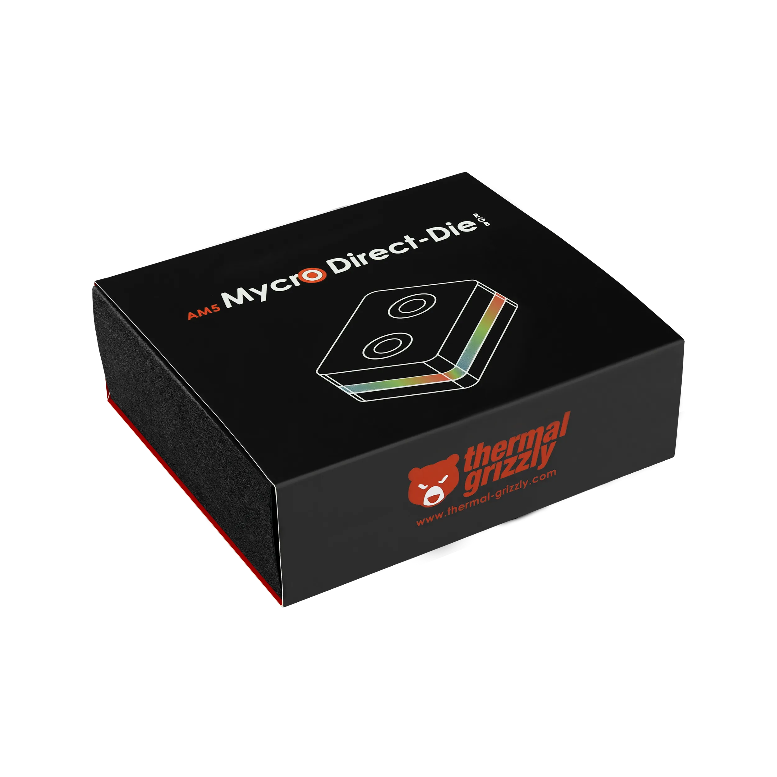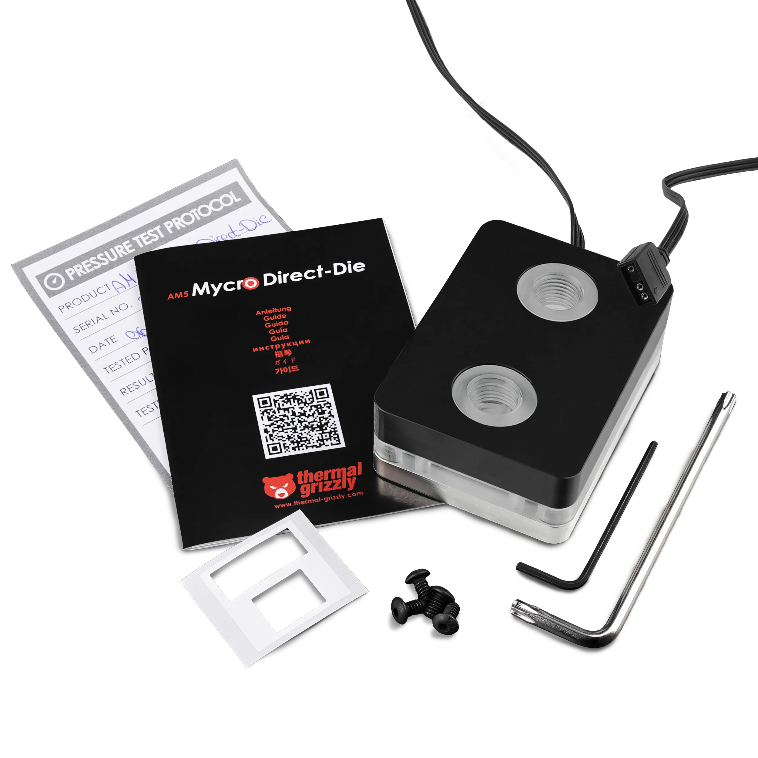 The AM5 Mycro Direct-Die RGB is a water cooler for AMD's Ryzen 7000 processors that sits directly on the chiplets of a delidded (beheaded) CPU. Made of nickel-plated copper, the Direct-Die water cooler offers outstanding thermal conductivity. This is further increased by an optimized structure of the microfins on the top. In addition, compared to normal water cooling, direct-die cooling eliminates the need for a layer of thermal conductive material as well as the CPU's heatspreader. This significantly improves the heat transfer from the CPU to the water cooling circuit.