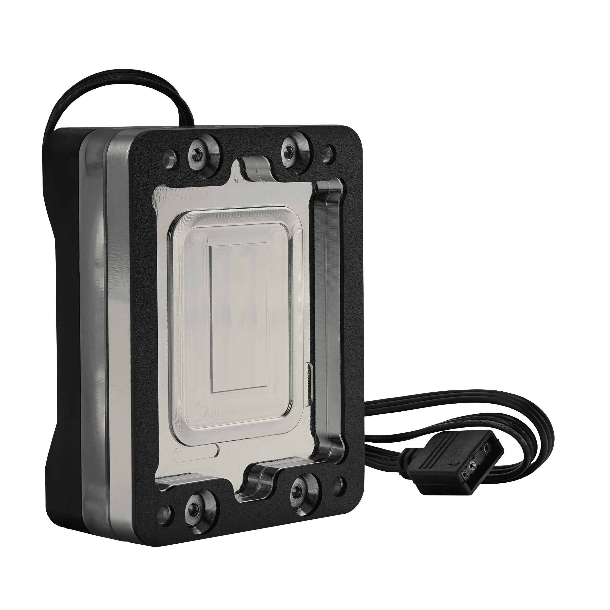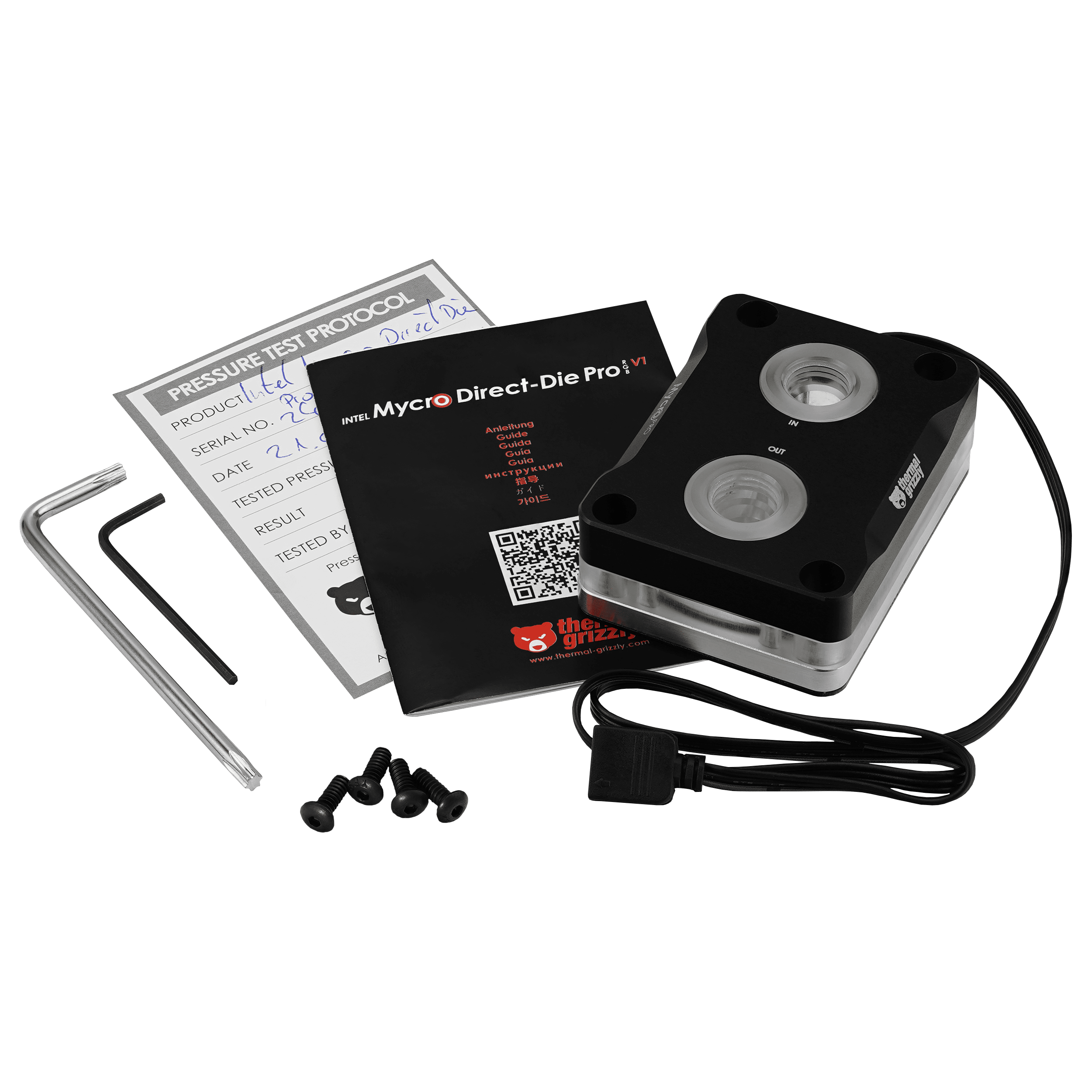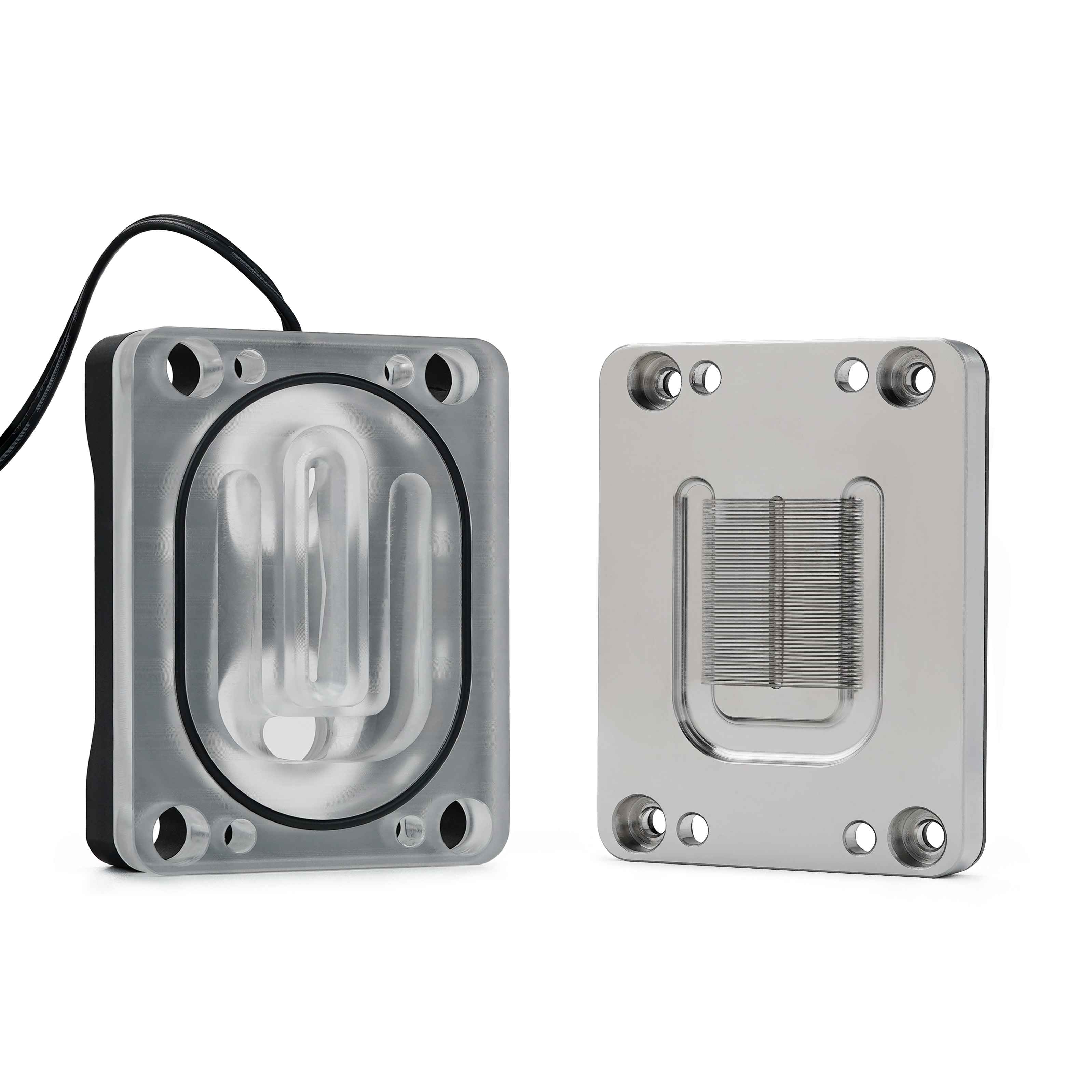 The aluminum cover of the Intel Mycro Direct-Die Pro RGB V1 visually resembles the Intel Mycro Direct-Die V1, but it rests on a block of tempered acrylic glass. RGB LEDs in the aluminum cover illuminate the acrylic glass from within, creating a visually striking effect as the lighting shines through the sides between the nickel-plated base plate and the black anodized cover, as well as from the top around the G1/4-inch fittings, elegantly showcasing the water cooler.