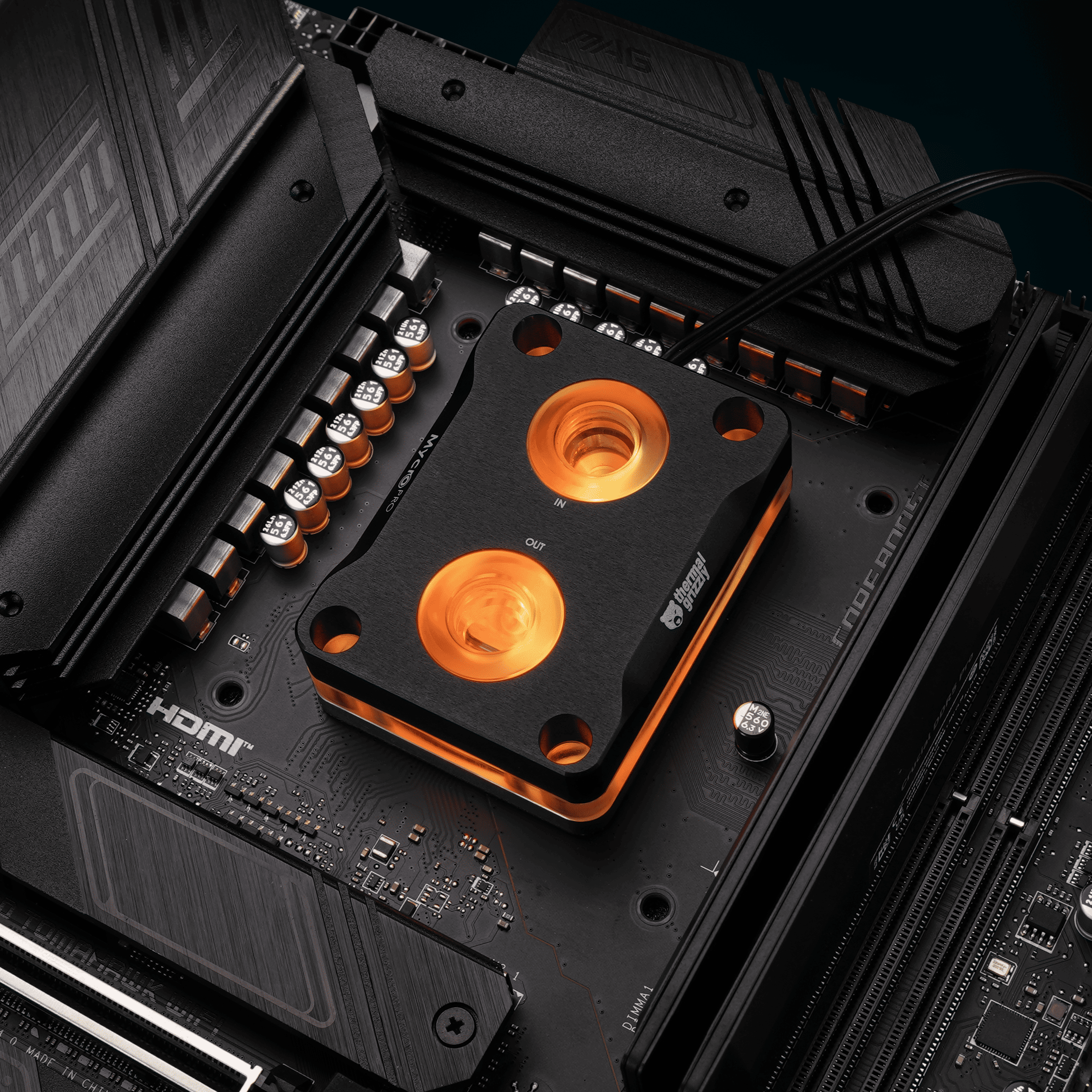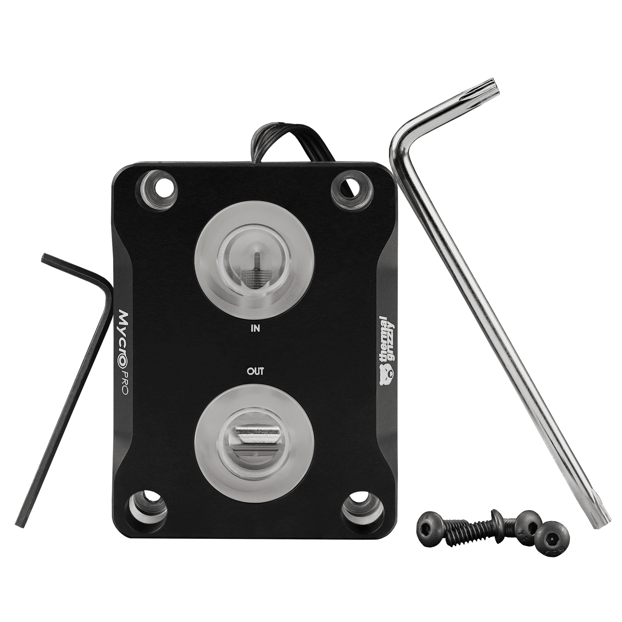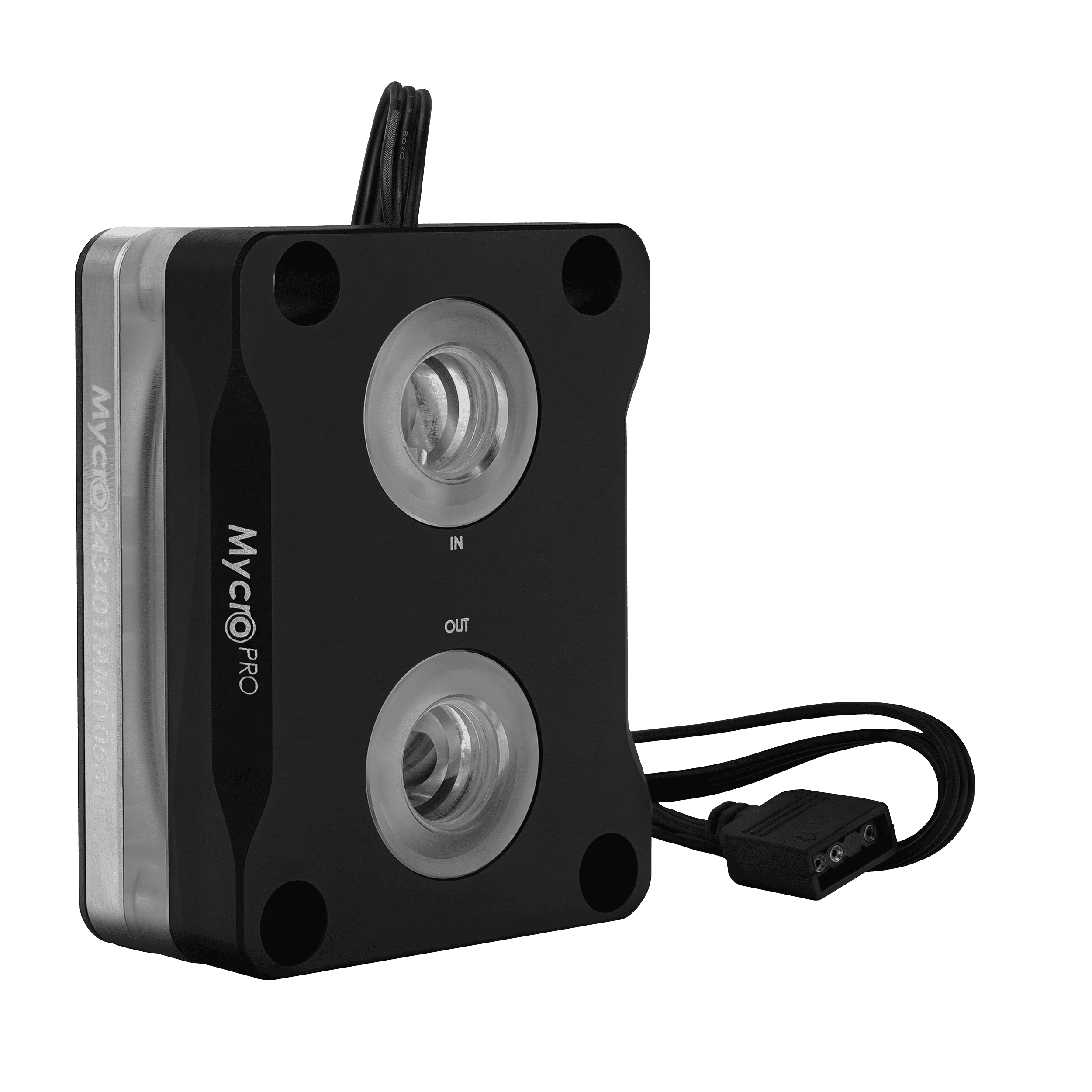 The aluminum cover of the Intel Mycro Direct-Die Pro RGB V1 visually resembles the Intel Mycro Direct-Die V1, but it rests on a block of tempered acrylic glass. RGB LEDs in the aluminum cover illuminate the acrylic glass from within, creating a visually striking effect as the lighting shines through the sides between the nickel-plated base plate and the black anodized cover, as well as from the top around the G1/4-inch fittings, elegantly showcasing the water cooler.