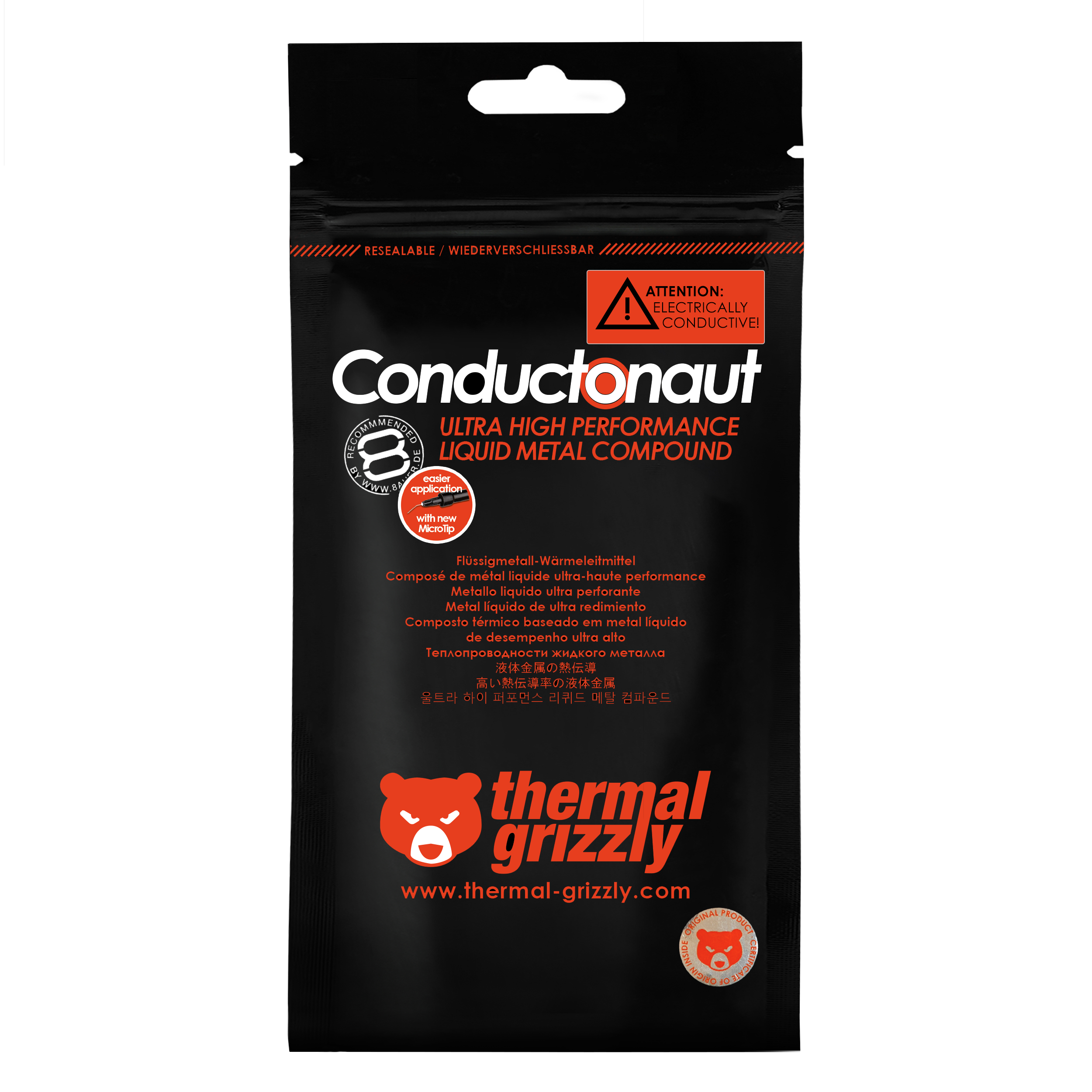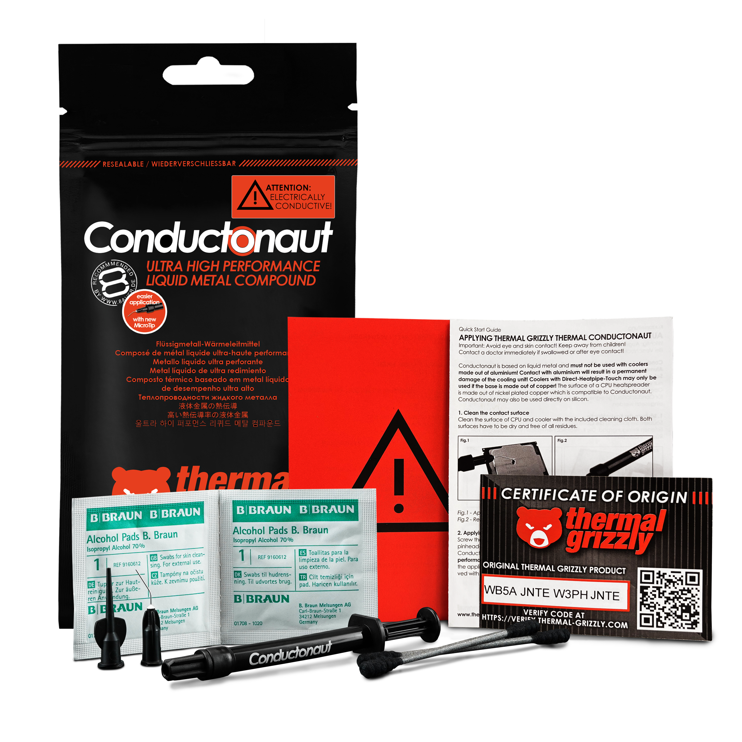 Thermal Grizzly Conductonaut is a liquid metal thermal compound based on a eutectic alloy. Our special mixture of metals like tin, gallium and indium, Conductonaut excels with a very high thermal conductivity. We recommend to apply Conductonaut on nickel plated surfaces since this will provide the best long term stability in performance.