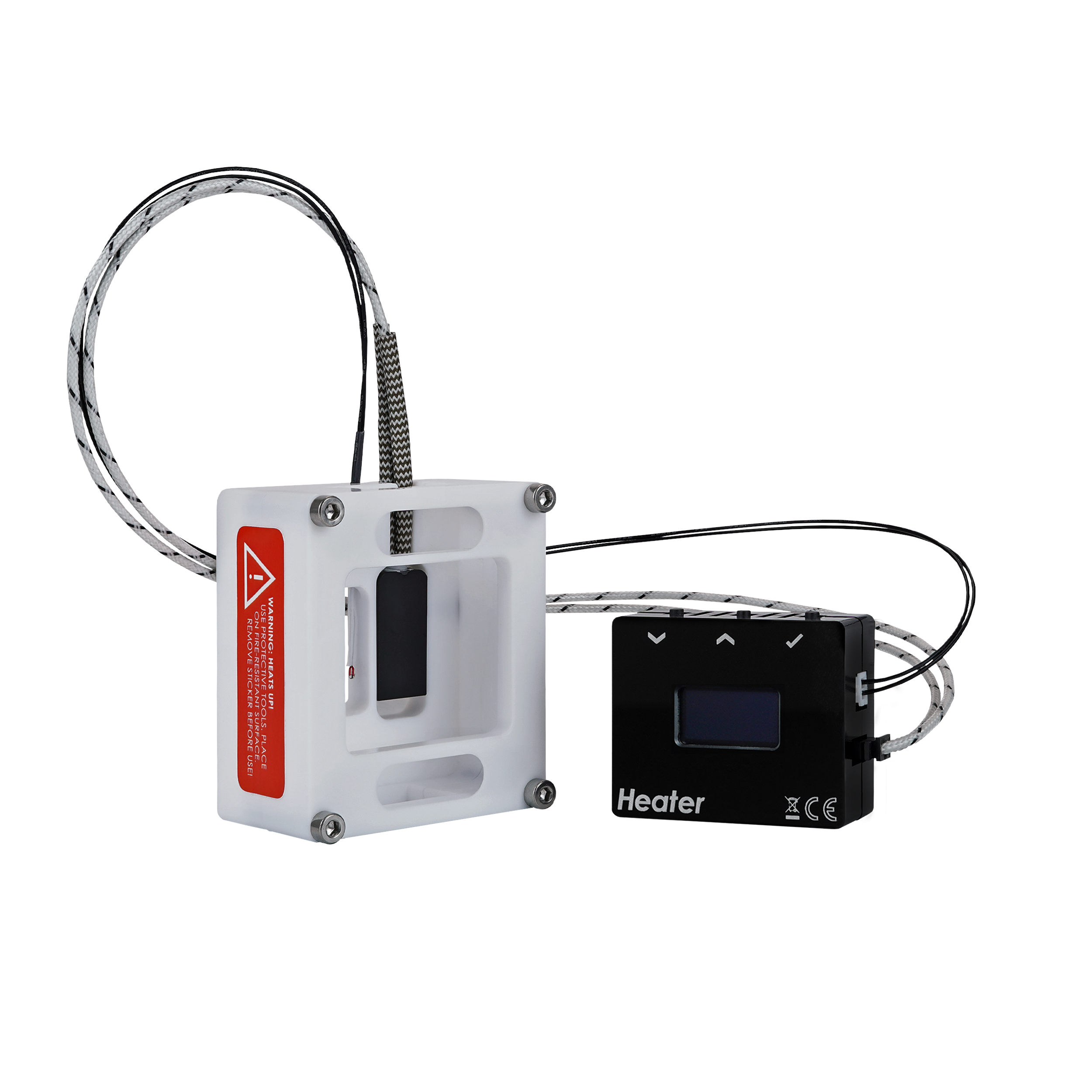 The Intel 1851 Delid-Die-Mate Heater V1 is a specially designed heating element for the Intel 1851 Delid-Die-Mate V1. The heater raises the temperature of both the CPU and the delidder to 165°C, the necessary temperature for delidding. The operation is controlled via a control unit with an OLED display, which is connected to the heater with two cables. A laptop/smartphone charger with at least 65 watts of power and a USB Type-C connector, which is not included, is required for the heater to operate. A small amount of thermal paste is also needed.