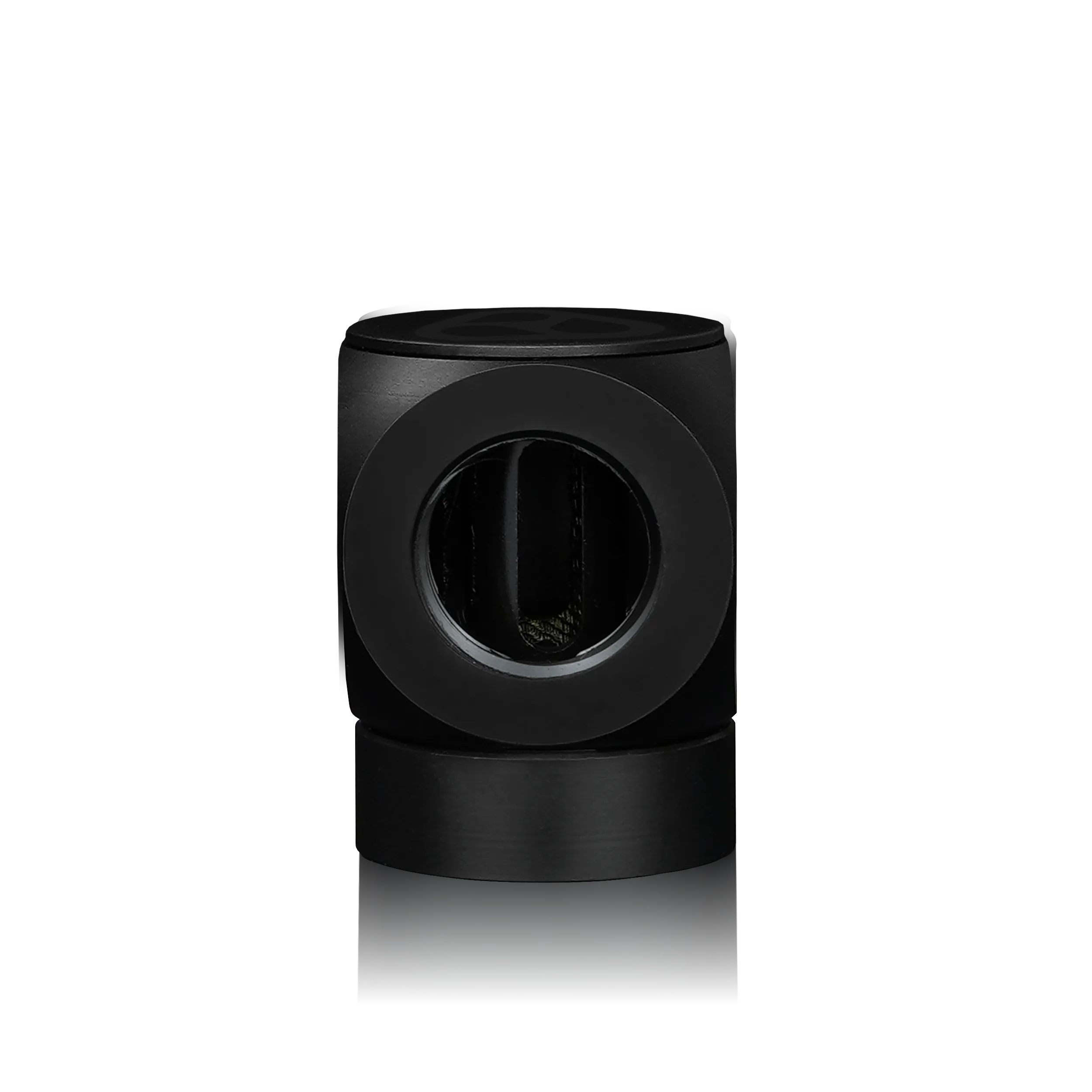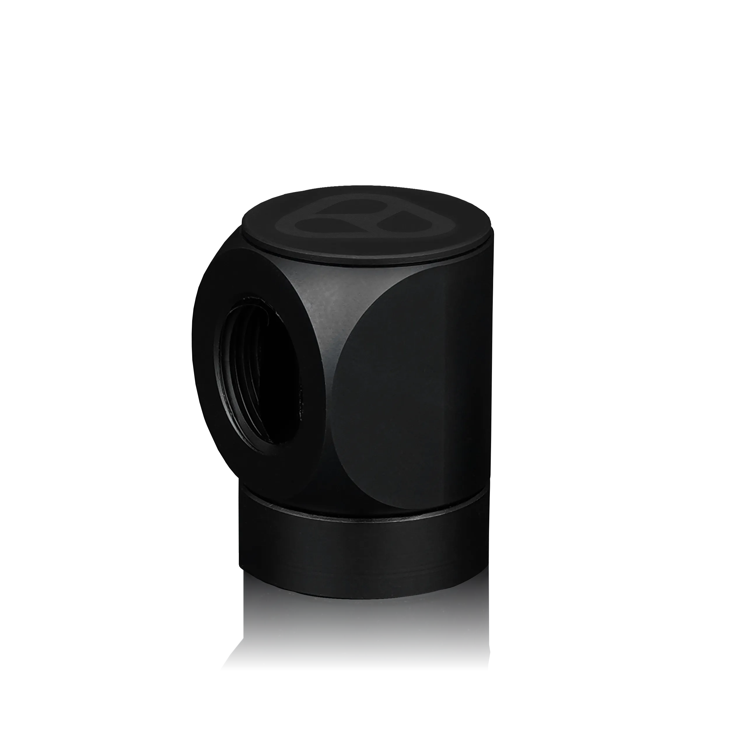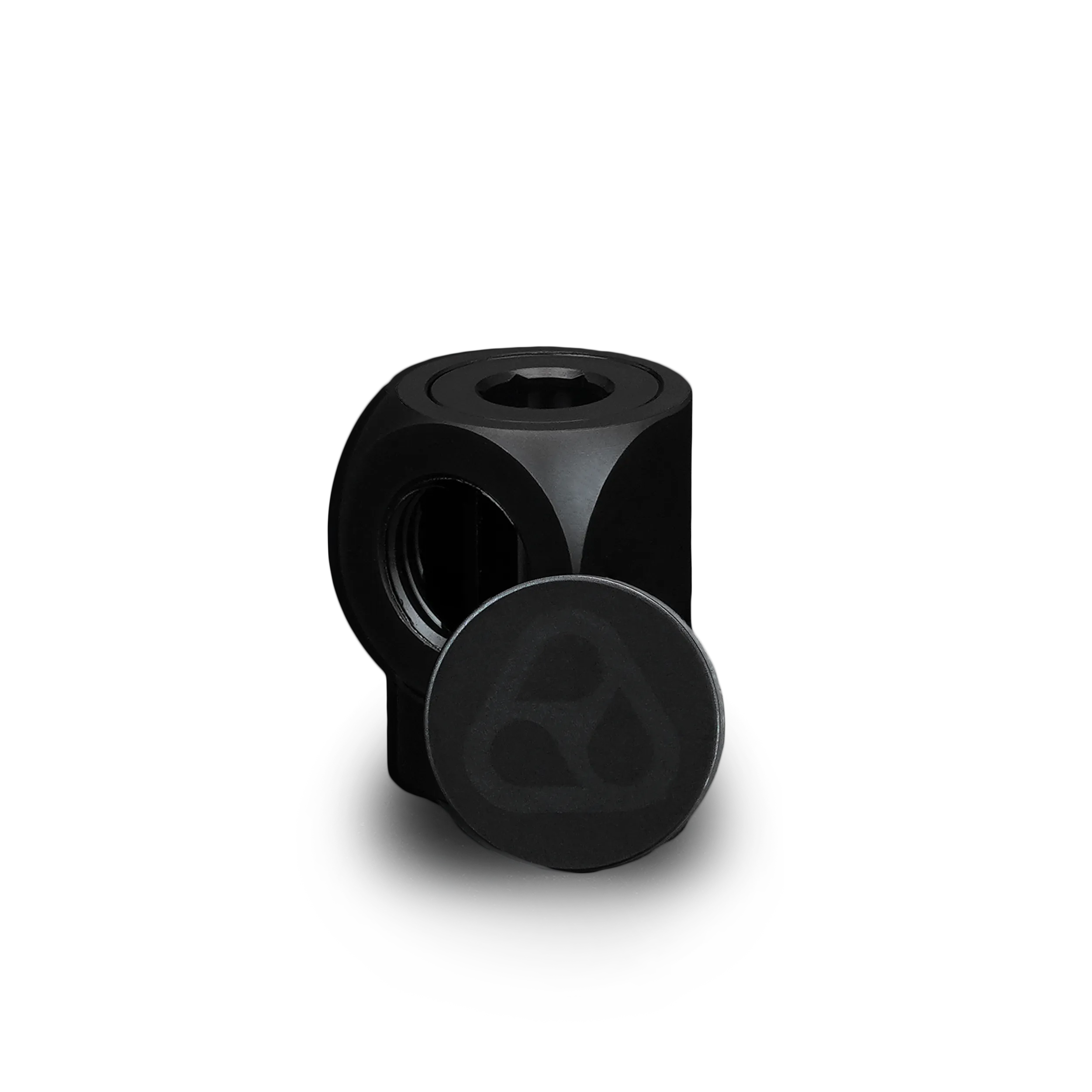 The DeltaMate Rotary - FF90° in black allows for modular combination with other DeltaMate Rotary and Extender Fittings due to its compact dimensions. The DeltaMate Rotary - FF90° has one male and one female G1/4” thread and offers a premium finish in the form of a matt black chromium plating that is also easy to clean. When using additional fittings, they mechanically lock the rotary joint together for maximum security. An optional aesthetic cover with the DeltaMate logo is included, which can be rotated to any orientation.