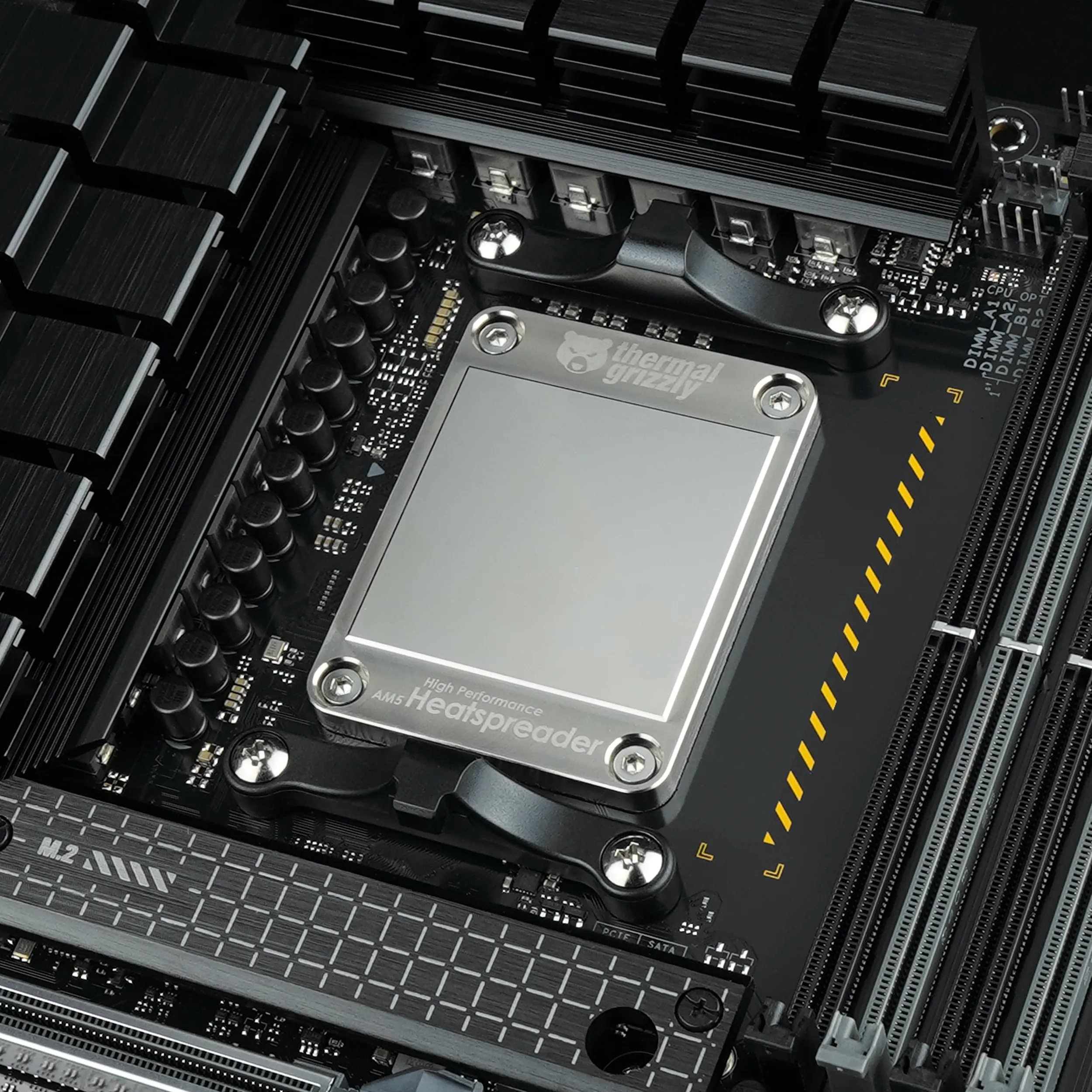 The AM5 High Performance Heatspreader (HPHS) is thinner compared to the stock AMD heatspreader. This means that the surface of the HPHS is approximately 2 millimeters lower. Depending on the cooler's mounting kit, this might result in the CPU cooler not making contact with the surface of the AM5 High Performance Heatspreader. Before retrofitting and powering on, we recommend verifying whether the CPU cooler can be mounted 2 mm lower in the Z-height from the motherboard. If the cooler’s mounting kit does not allow for a deeper installation, the AM5 Adapter & Offset Mounting Kit can provide a solution.