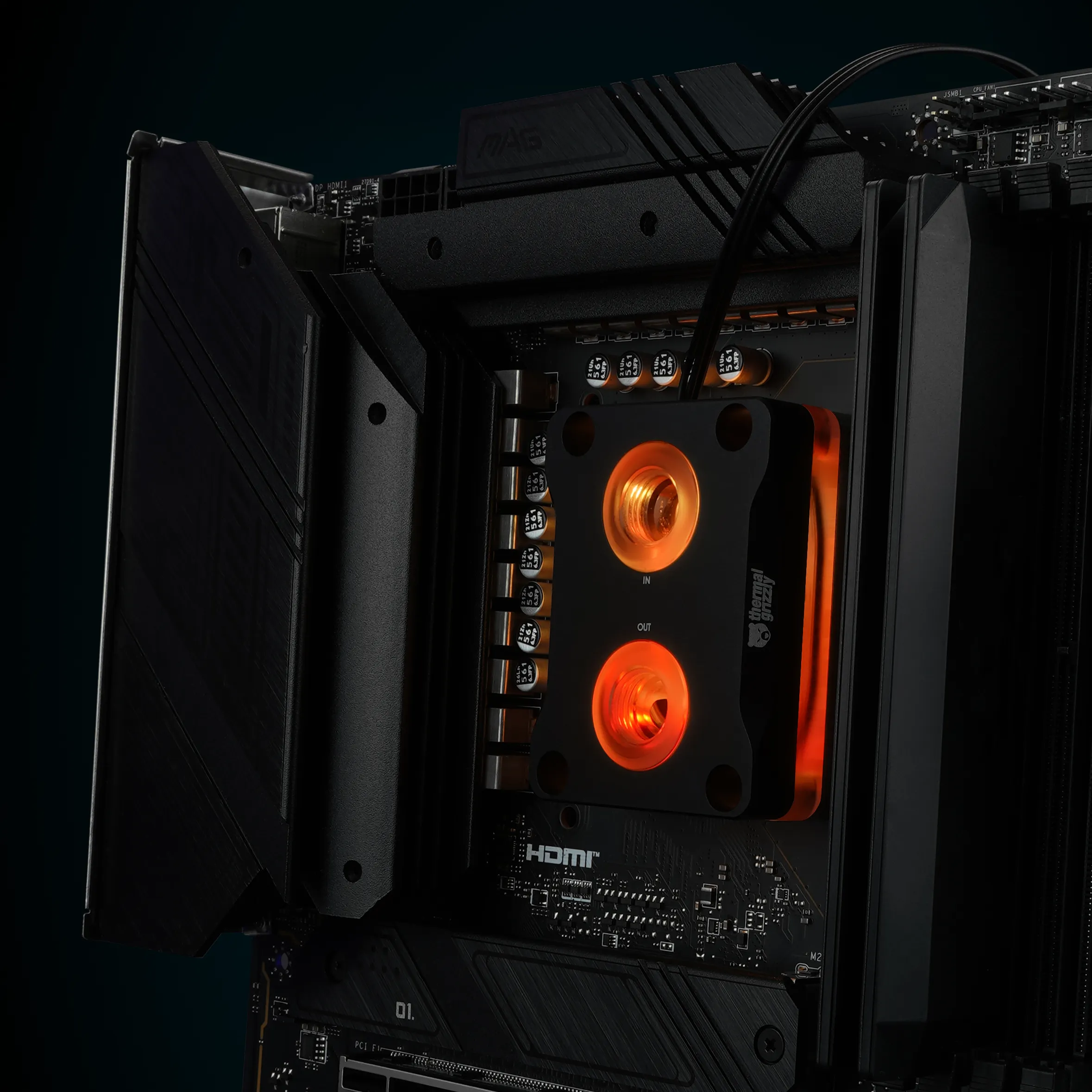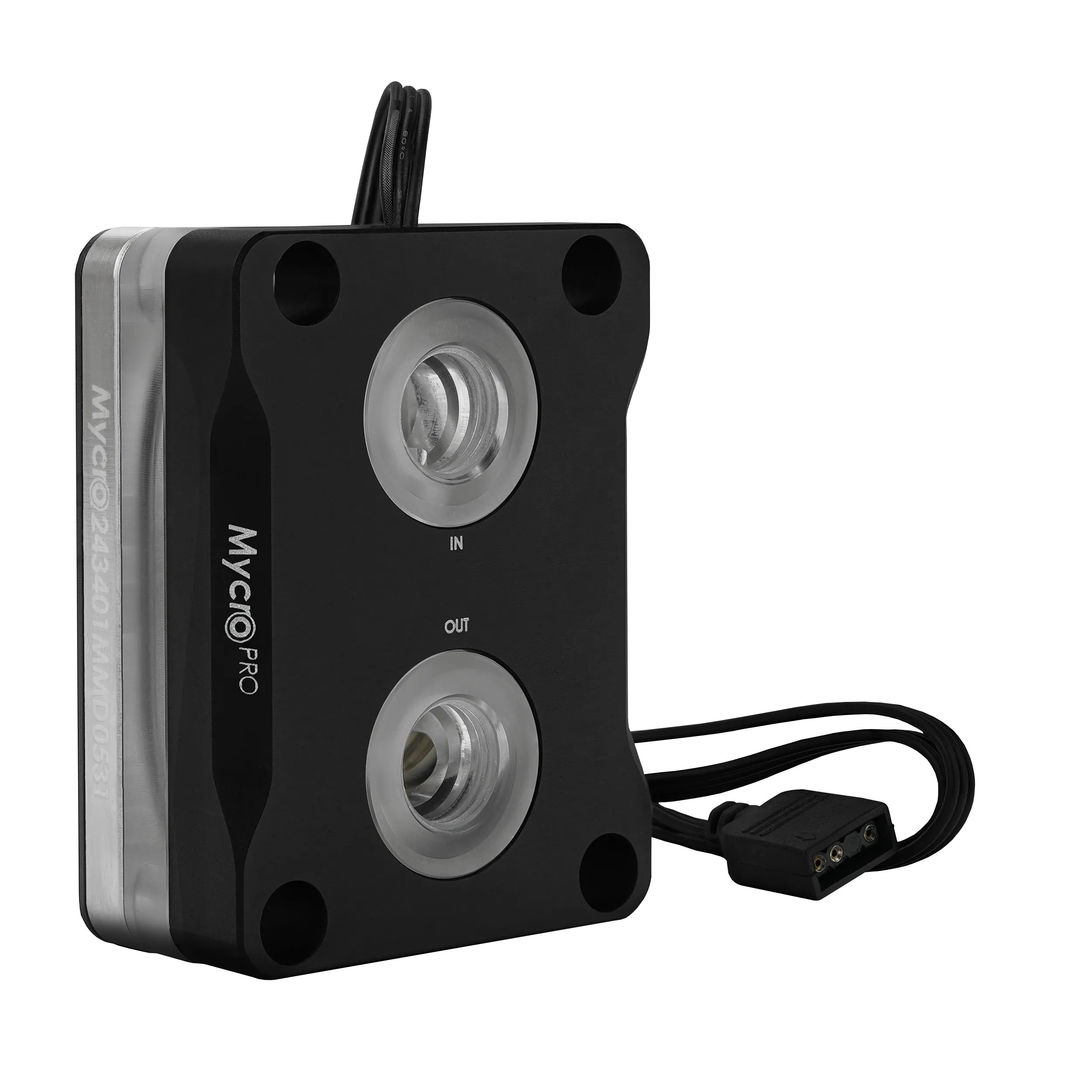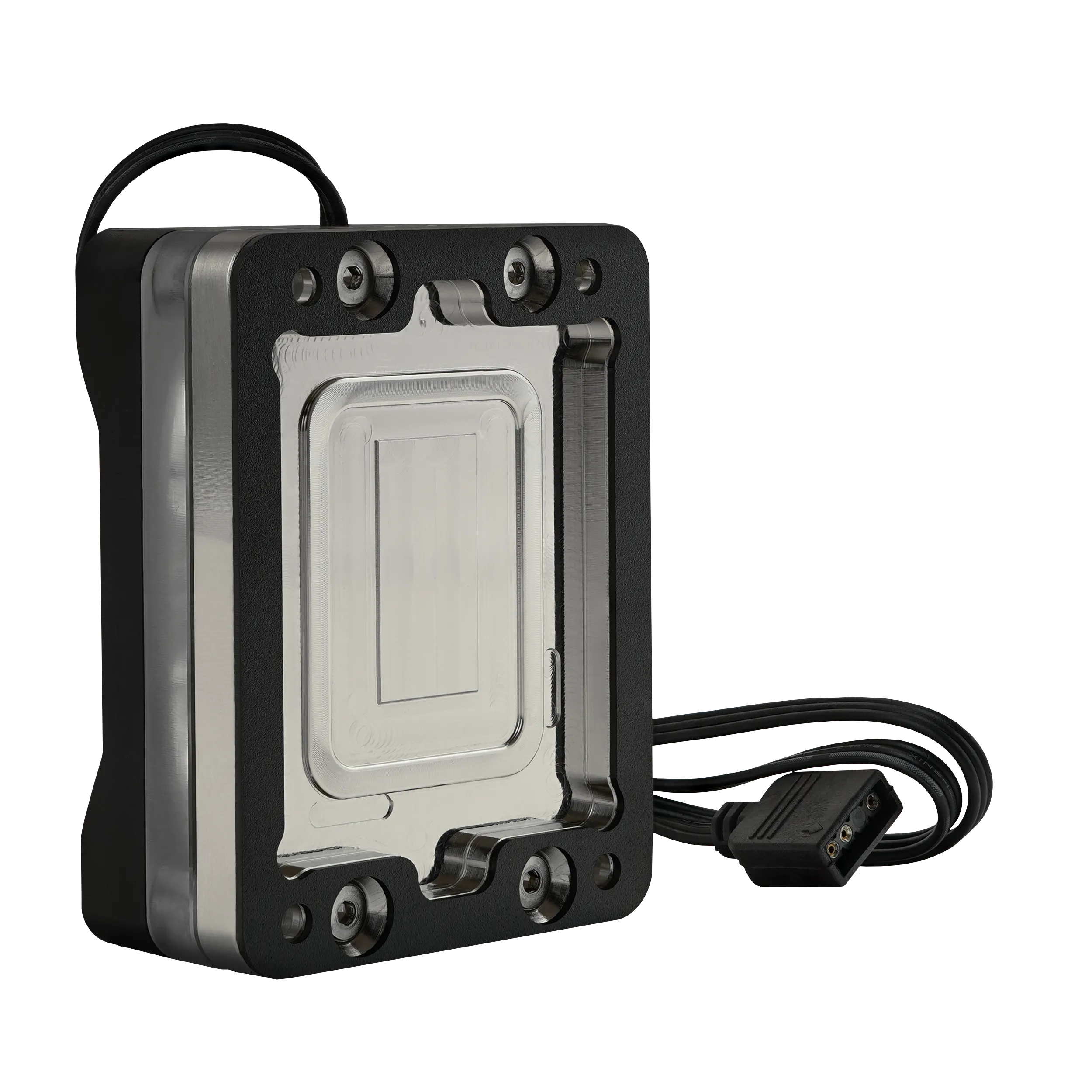 RGB LEDs are located under the aluminum lid, controllable via a 3-pin ARGB header (+5V/DATA/GND) on the motherboard. These LEDs illuminate the acrylic under the lid and the G1/4-inch fittings on the lid.