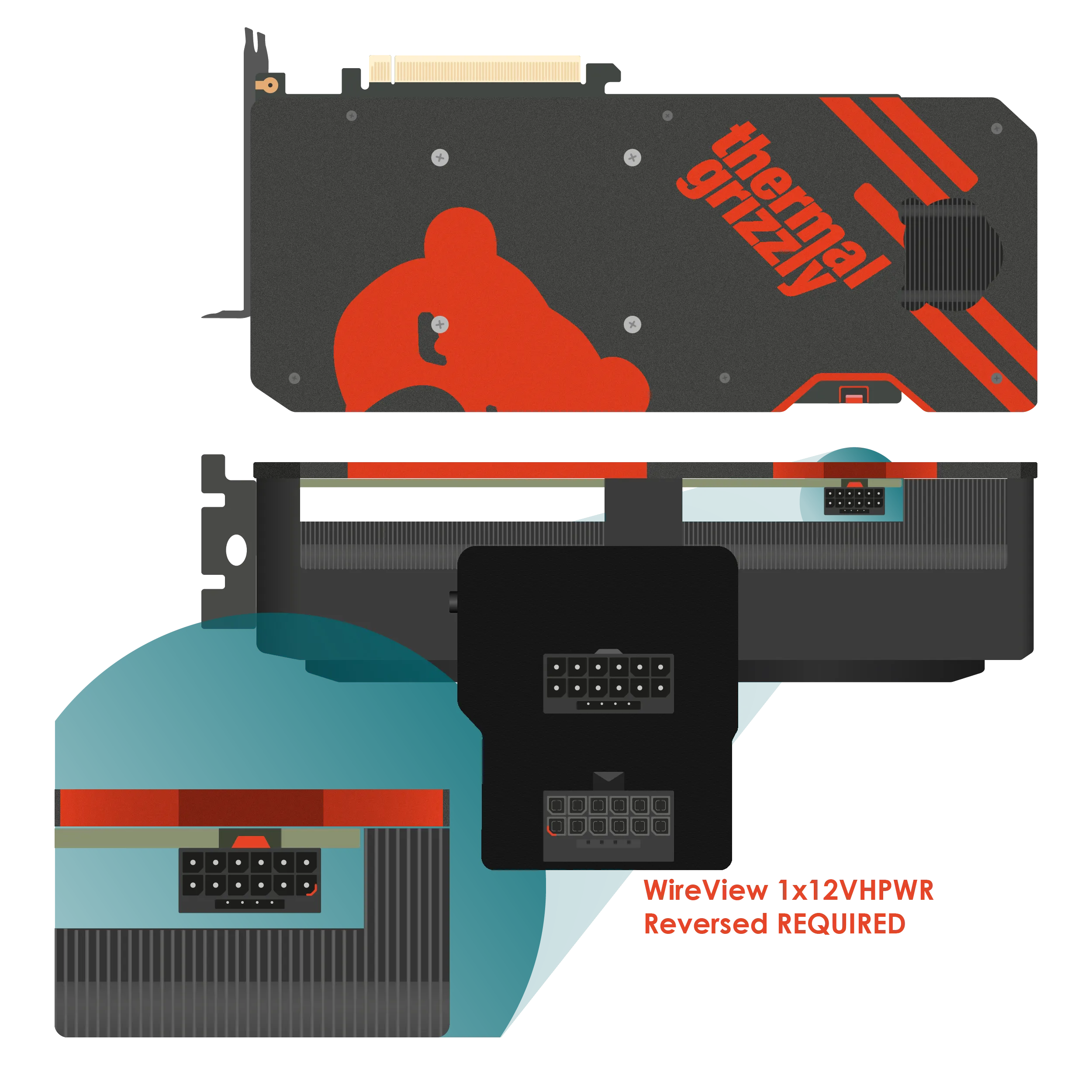 The WireView GPU is available in "N" and "R" versions regardless of the number of 8-pin PCIe connectors (or the 12VHPWR plug). "N" stands for the normal orientation of the PCIe connectors on the PCIe expansion card, while "R" stands for the rotated (reversed) orientation. In the normal orientation (N), the retaining clip of the connector points away from the PCB of the expansion card. In the rotated orientation (R), the connector's retaining clip points towards the PCB.