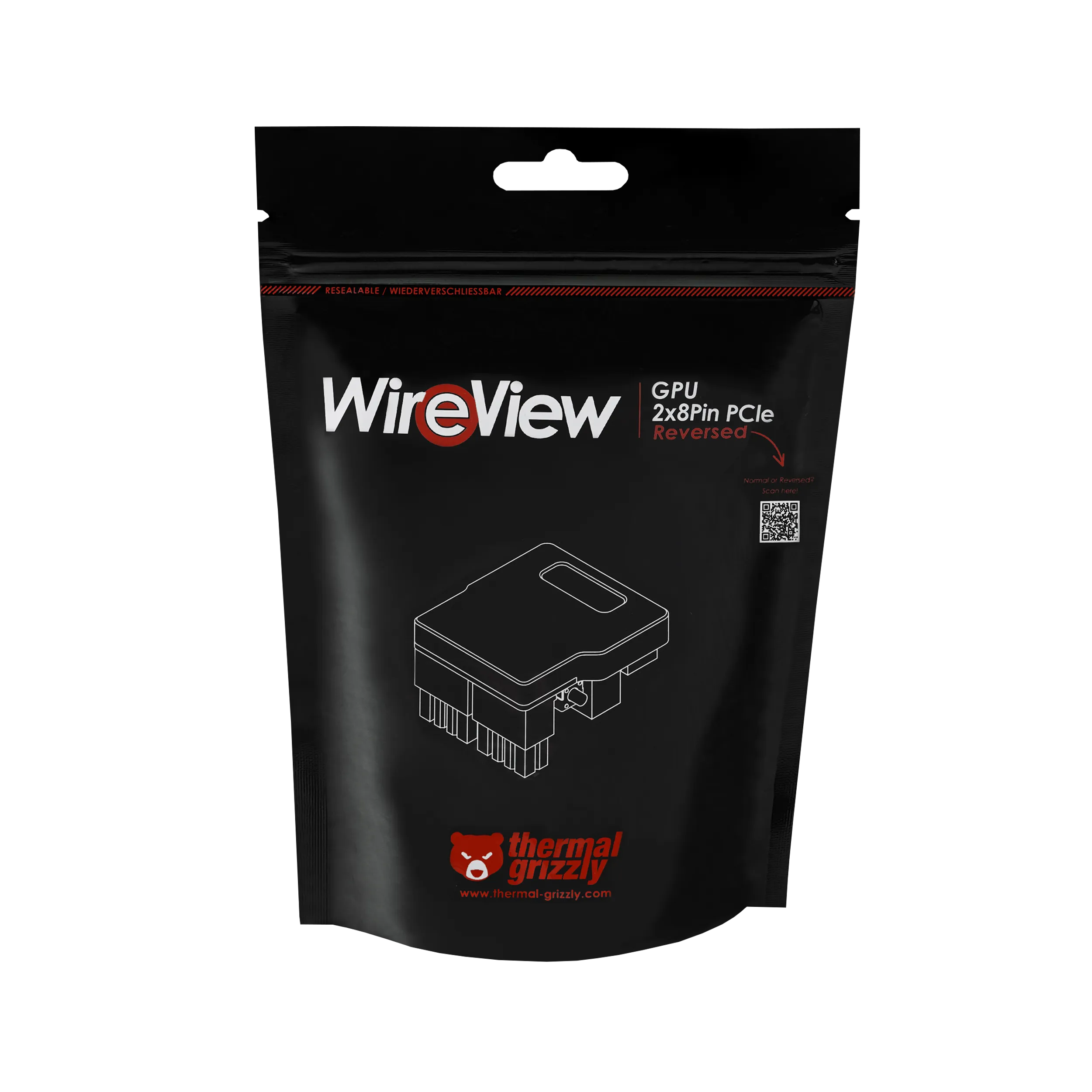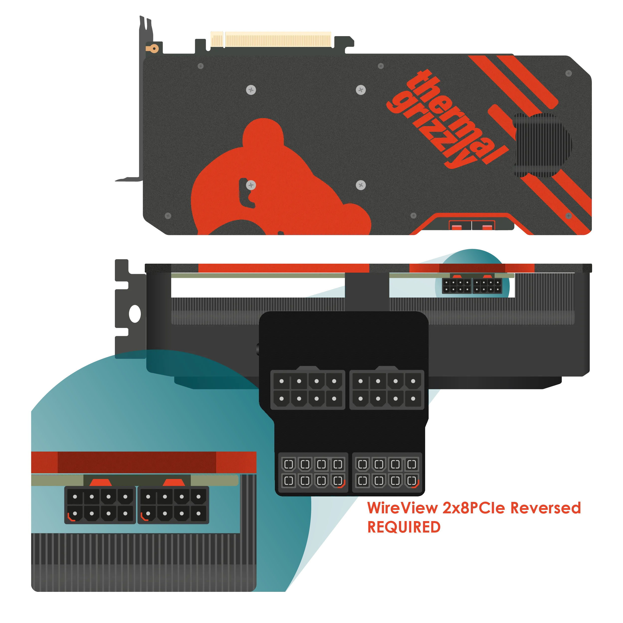 The WireView GPU is available in "N" and "R" versions regardless of the number of 8-pin PCIe connectors (or the 12VHPWR plug). "N" stands for the normal orientation of the PCIe connectors on the PCIe expansion card, while "R" stands for the rotated (reversed) orientation. In the normal orientation (N), the retaining clip of the connector points away from the PCB of the expansion card. In the rotated orientation (R), the connector's retaining clip points towards the PCB.