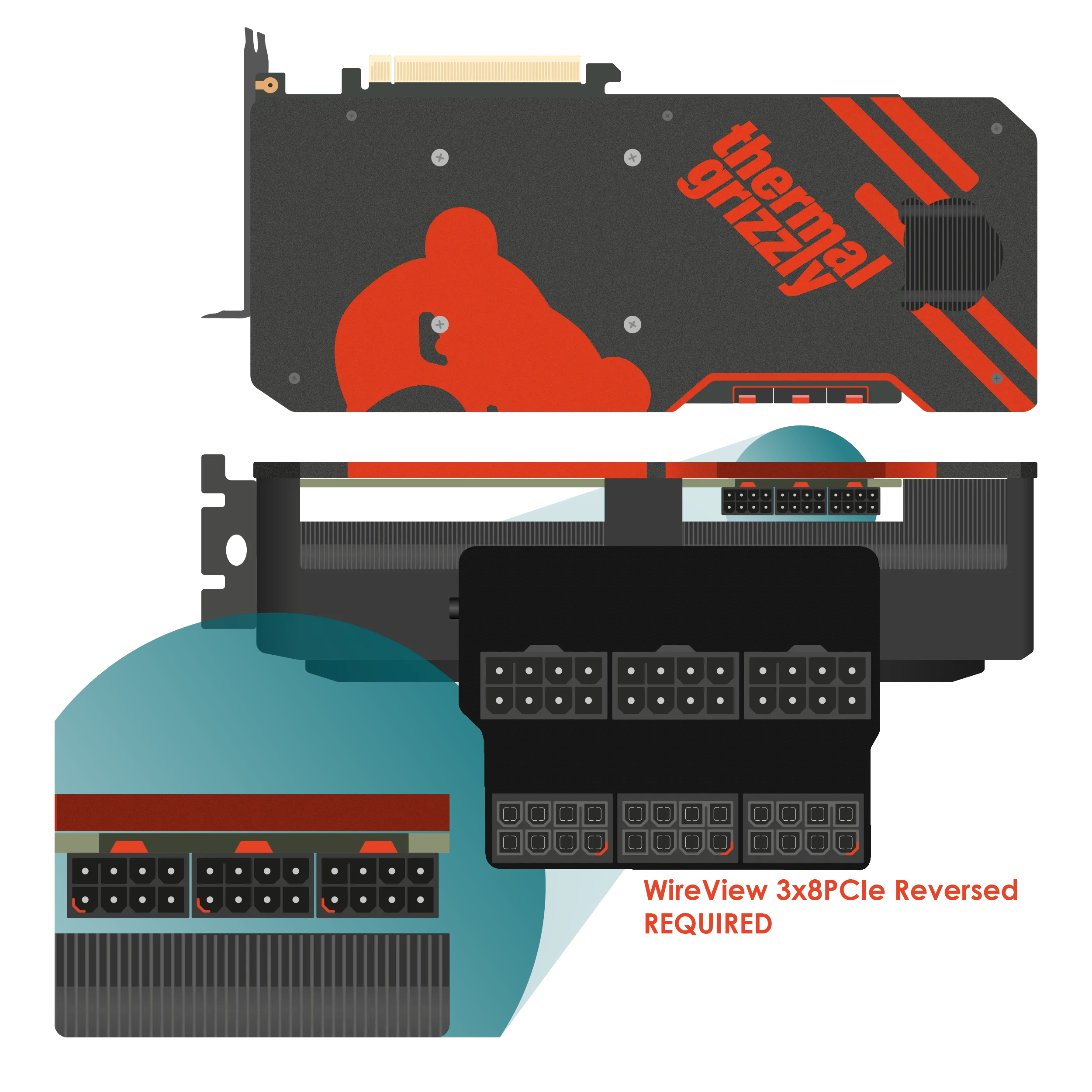 The WireView GPU is available in "N" and "R" versions regardless of the number of 8-pin PCIe connectors (or the 12VHPWR plug). "N" stands for the normal orientation of the PCIe connectors on the PCIe expansion card, while "R" stands for the rotated (reversed) orientation. In the normal orientation (N), the retaining clip of the connector points away from the PCB of the expansion card. In the rotated orientation (R), the connector's retaining clip points towards the PCB.