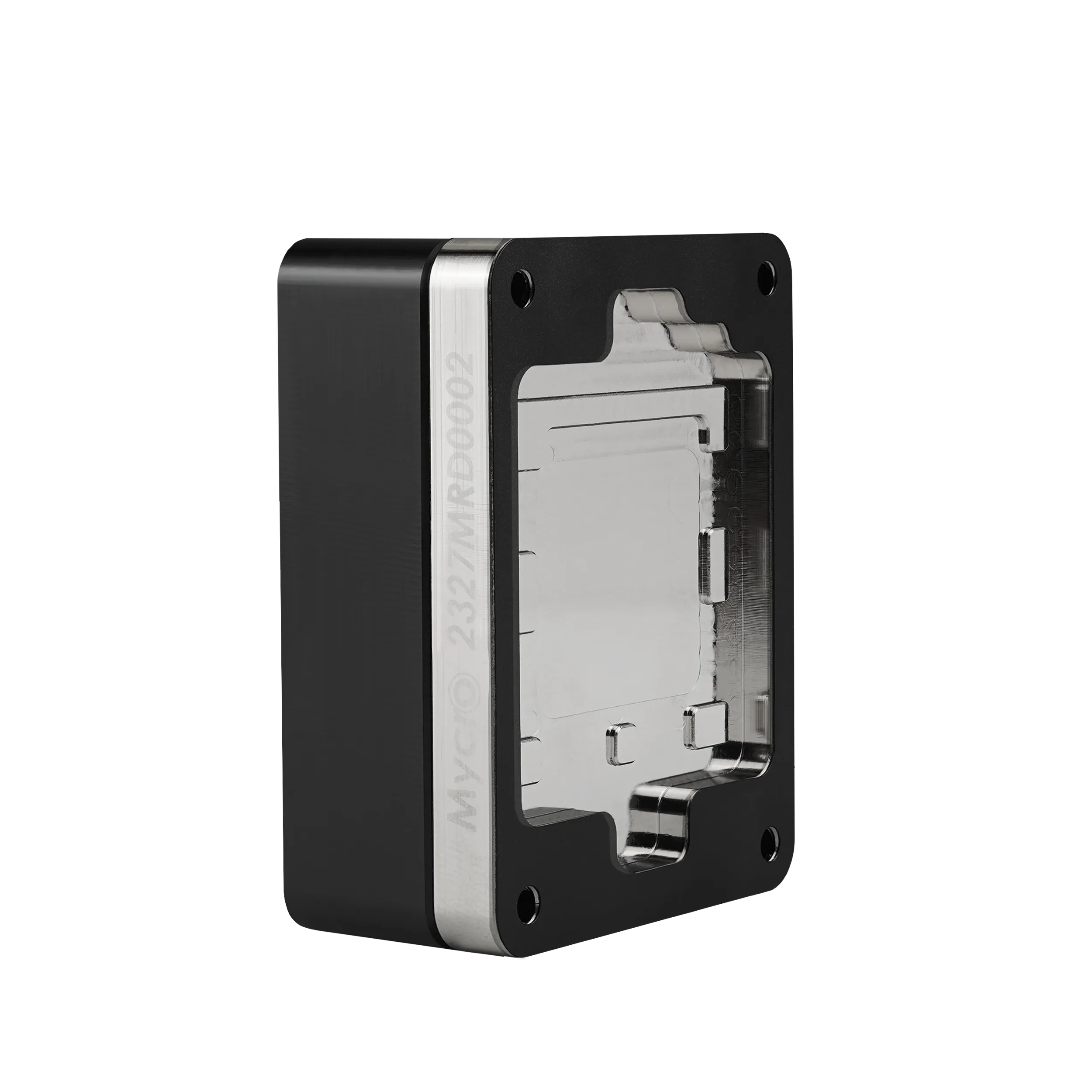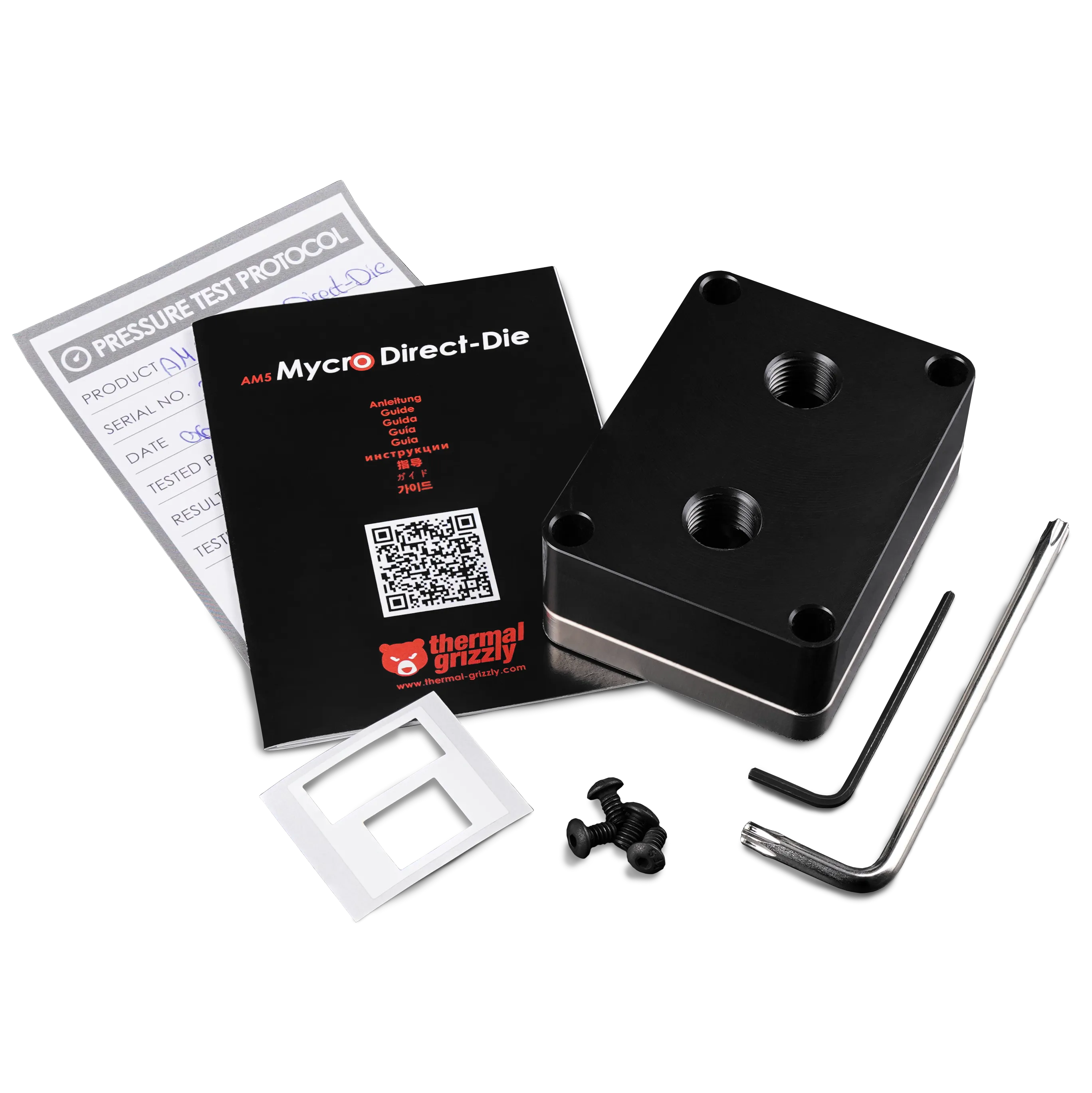El AM5 Mycro Direct-Die es un enfriador de agua para los procesadores Ryzen 7000 de AMD que se apoya directamente sobre los chiplets de una CPU delidida (refrigerada). Fabricado en cobre niquelado, el refrigerador de agua Direct-Die ofrece una conductividad térmica excepcional. Esto se ve reforzado por la estructura optimizada de las microfinas de la parte superior. Además, en comparación con la refrigeración por agua normal, la refrigeración direct-die elimina una capa de medio de transferencia de calor y el disipador de calor de la CPU. Esto mejora significativamente la transferencia de calor de la CPU al circuito de refrigeración por agua. La cubierta de la AM5 Mycro Direct-Die está fabricada en polioximetileno (POM) mecanizado por CNC y está equipada con una entrada y una salida en forma de roscas G1/4 de pulgada.