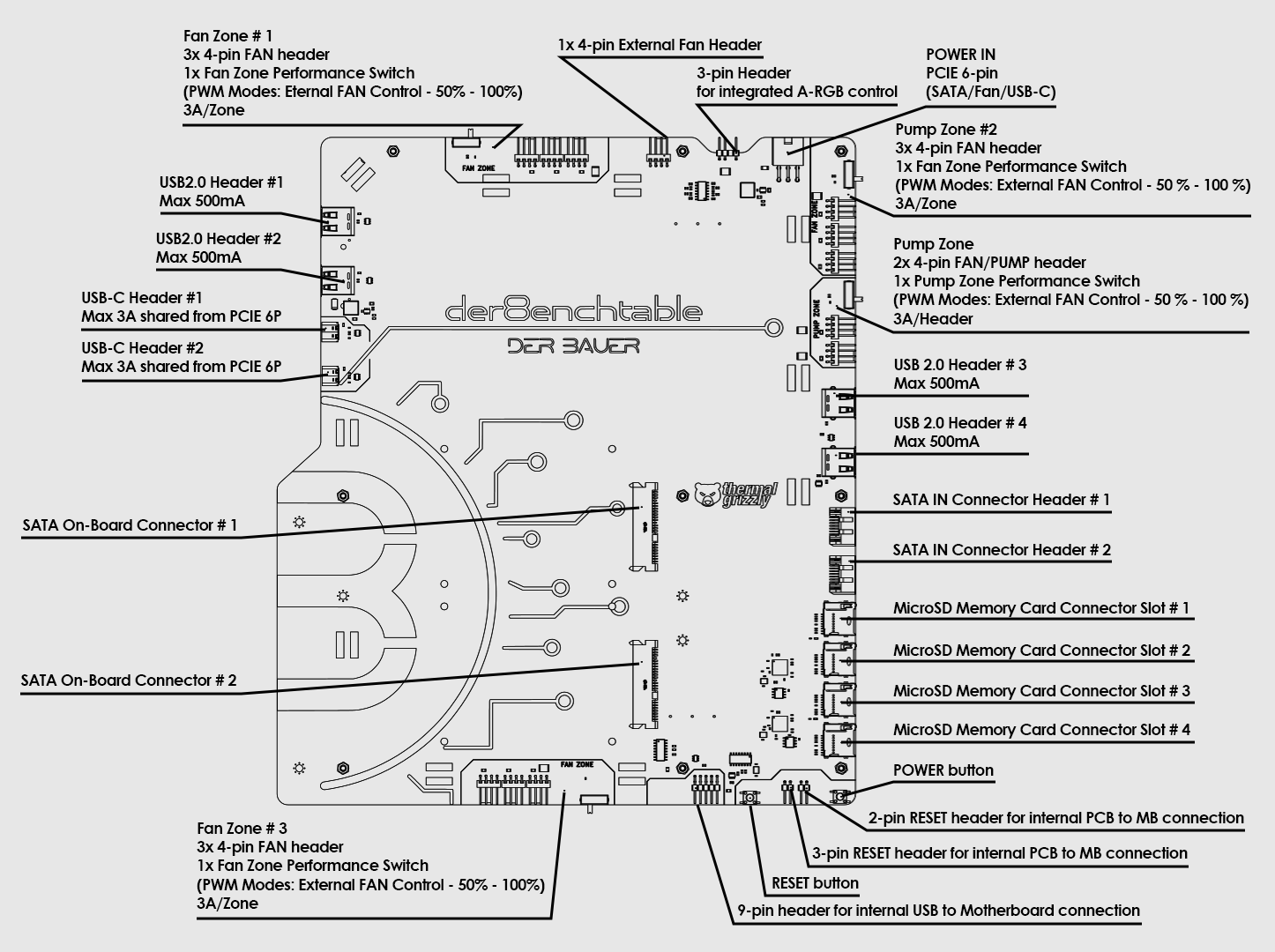 En total, tres controladores de ventiladores (zonas de ventilador), cada uno con tres conectores de ventilador de 4 pines, permiten probar el hardware con condiciones de refrigeración uniformes. Cada zona puede ajustarse individualmente mediante un interruptor a una velocidad del 50 % o del 100 %. Cada zona proporciona 3 A de potencia para los ventiladores y está protegida por un fusible. También es posible que la placa base controle externamente las zonas de ventilador del der8enchtable; para ello, en la PCB hay un conector de 4 pines que se conecta al header correspondiente de la placa base.