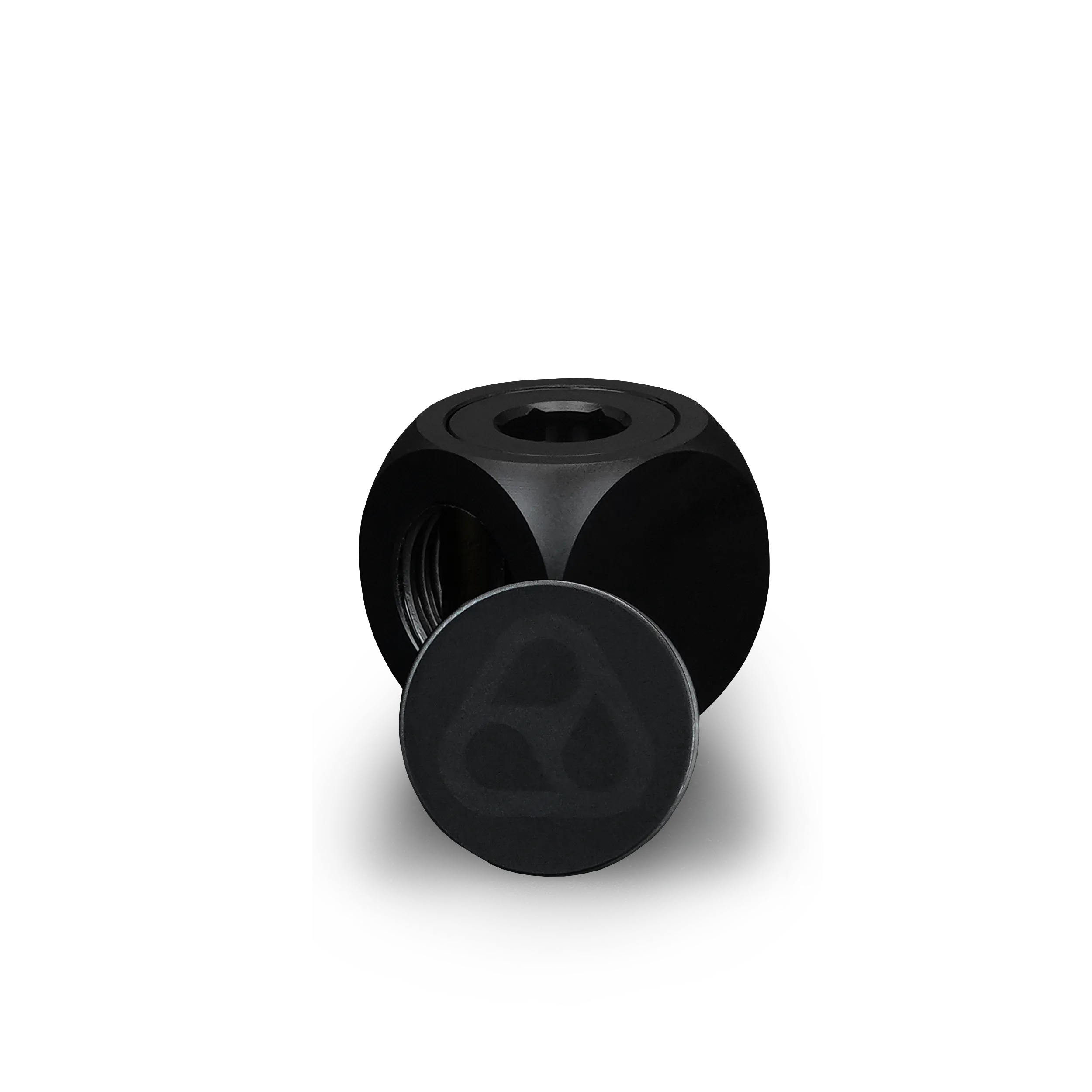 El DeltaMate Rotary - T en negro permite la combinación modular con otros racores DeltaMate Rotary y Extender gracias a sus dimensiones compactas. El DeltaMate Rotary - T cuenta con una rosca G1/4” macho y dos roscas G1/4” hembra, y ofrece un acabado premium con recubrimiento de cromo negro mate que además es fácil de limpiar. Al usar racores adicionales, estos bloquean mecánicamente la junta giratoria para garantizar la máxima seguridad. Incluye una tapa estética opcional con el logotipo de DeltaMate, que puede girarse a cualquier orientación.