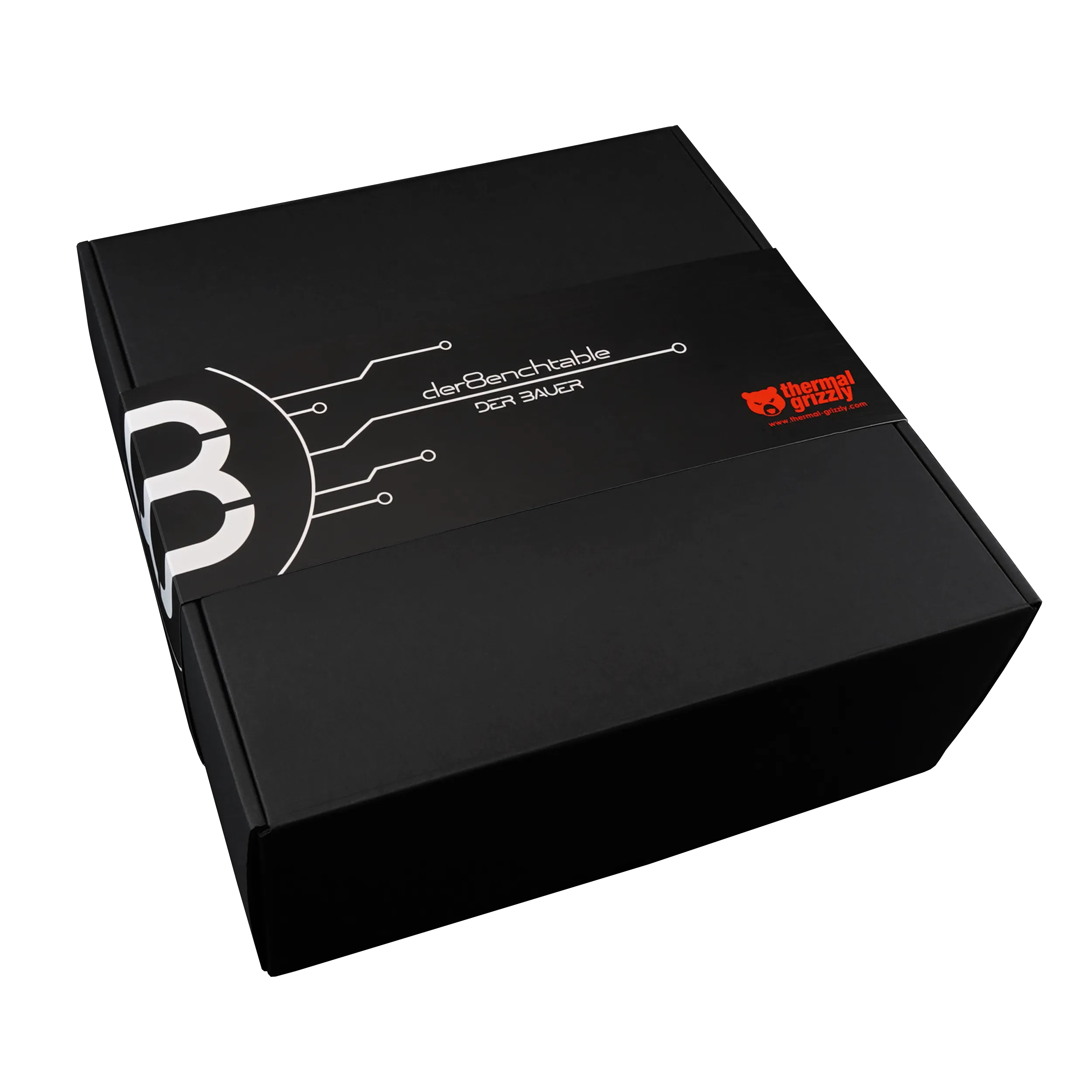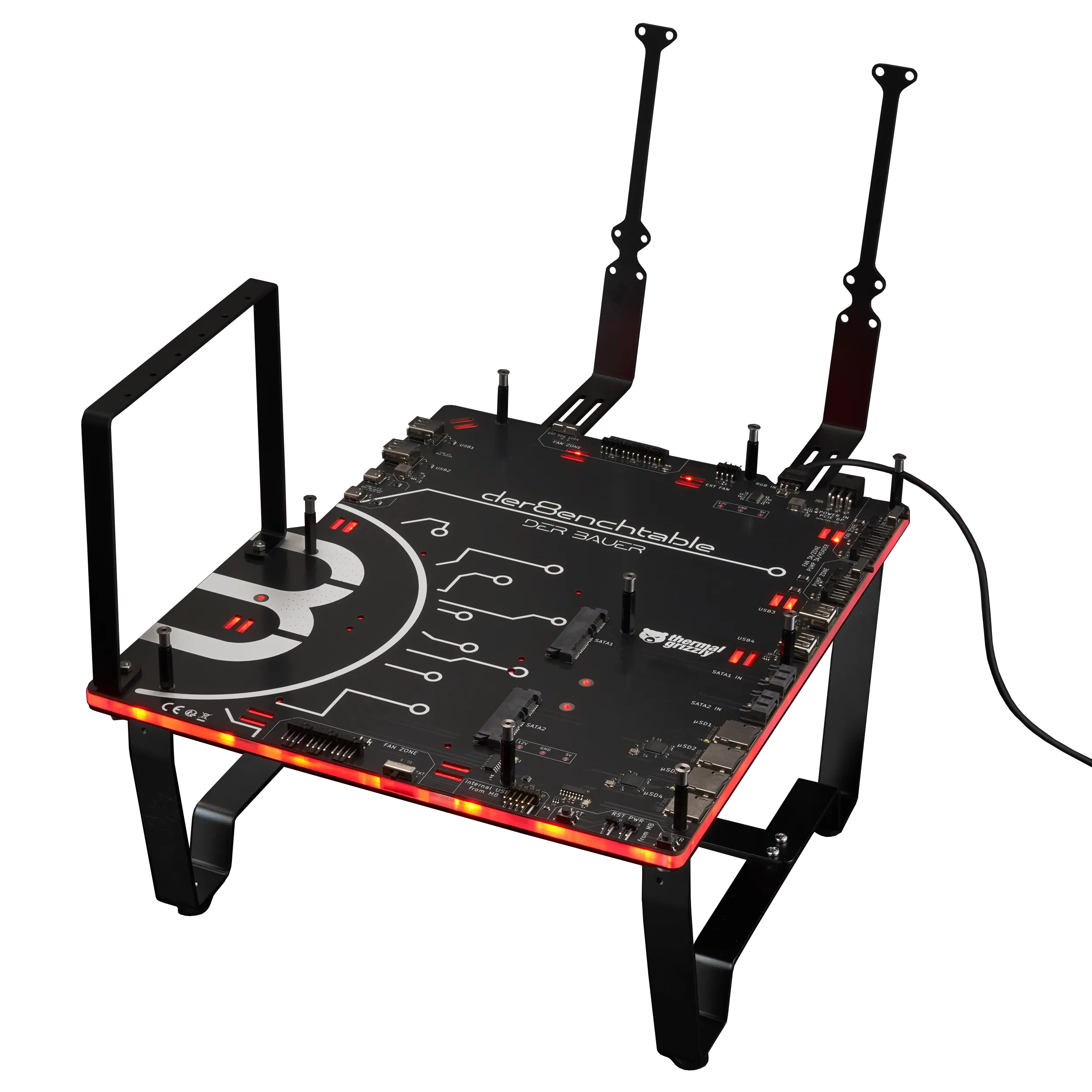 El der8enchtable es una colaboración entre Thermal Grizzly, Jon “elmor” Sandström (ElmorLabs) y Roman “der8auer” Hartung. Además de las funciones de una mesa de pruebas estándar —como los soportes integrados para radiadores y fuente de alimentación—, el der8enchtable incluye una unidad base con una placa de circuito impreso (PCB) integrada para conectar el hardware bajo prueba. Para resultados de prueba consistentes, los ventiladores pueden controlarse mediante tres controladores de ventilador, cada uno con tres conectores para ventiladores de 4 pines. Cada zona de ventiladores puede configurarse de forma independiente al 50 % o al 100 % de velocidad, suministra 3 A de potencia a los ventiladores y cuenta con su propio fusible. Además, las zonas de ventiladores del der8enchtable pueden controlarse externamente desde la placa base.