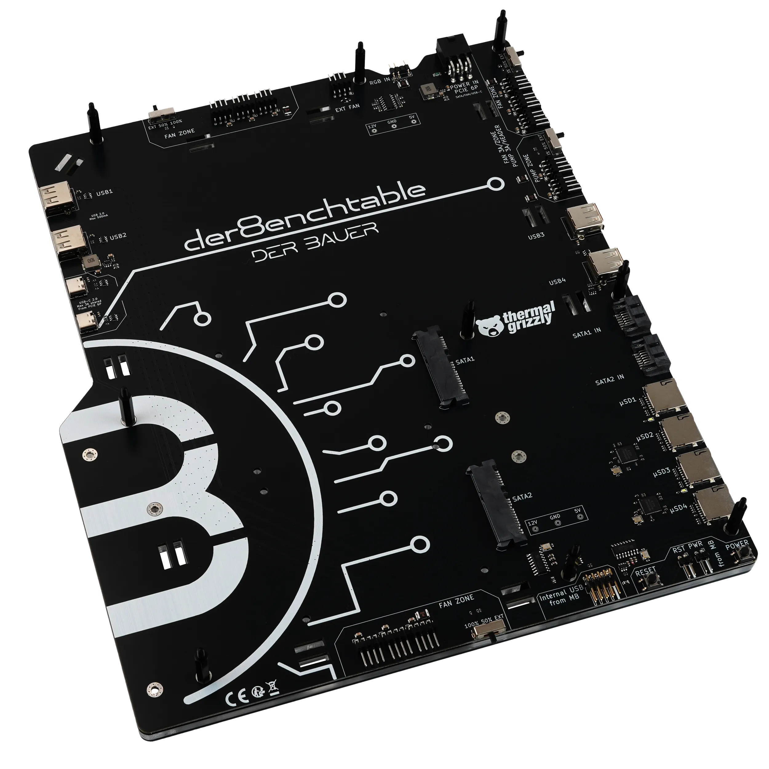 Las pruebas y mediciones de hardware suelen requerir controladores, BIOS o un sistema operativo. Para simplificarlo, se pueden montar medios de almacenamiento directamente en la mesa de pruebas. En el PCB se pueden instalar hasta dos unidades SSD de 2,5 pulgadas y además ofrece cuatro ranuras para tarjetas microSD, una alternativa económica a los SSD en cuanto a precio por gigabyte.