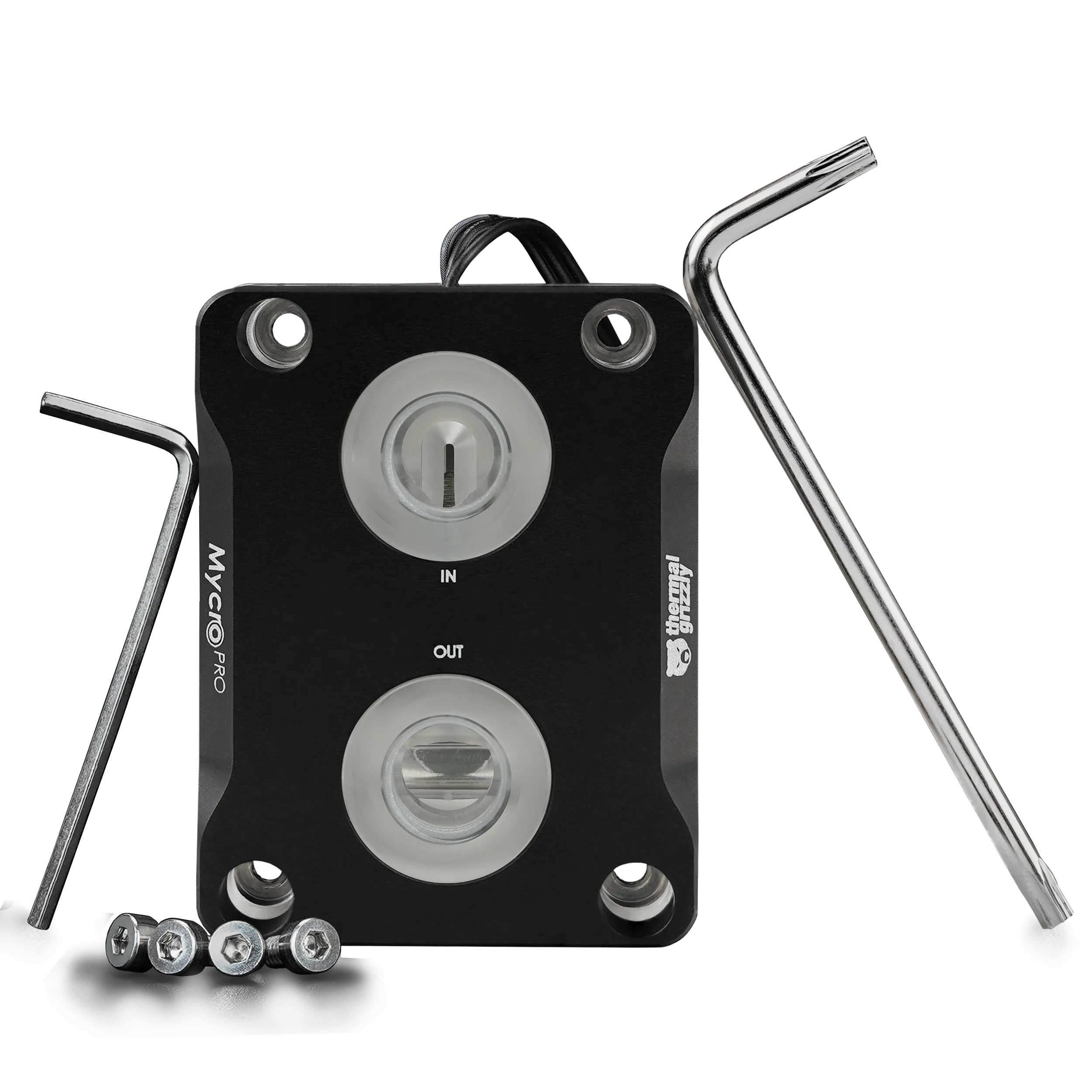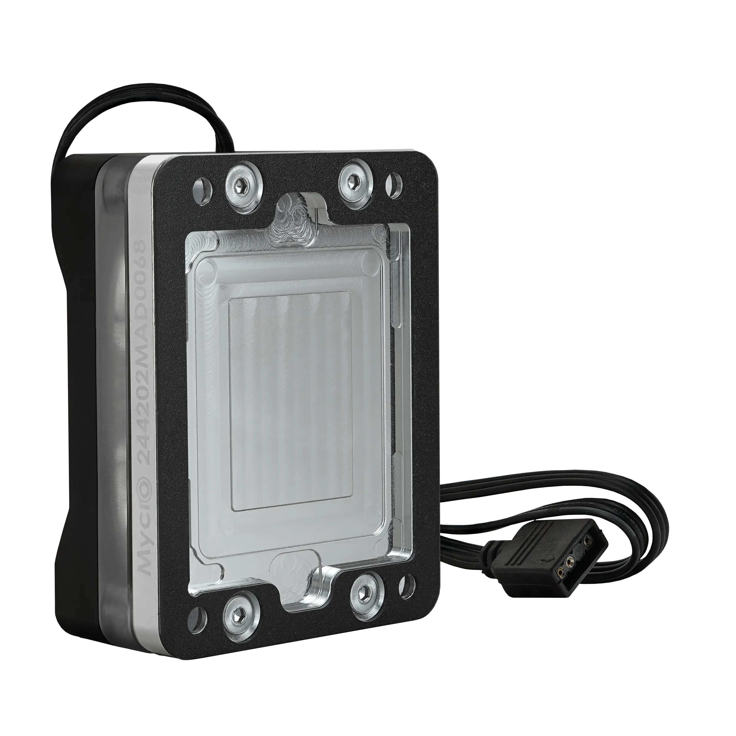 El Intel 1851 Mycro Direct-Die Pro RGB V1 cuenta con un sistema de inyección en la superficie del bloque y el ancho de las ranuras del canal de refrigeración ha sido optimizado. La placa fría del bloque está hecha de cobre niquelado y se monta directamente sobre el chip de la CPU. Para esto, el Mecanismo de Carga Integrado (ILM) de la placa base debe ser retirado, y la CPU debe ser delidded. El niquelado de la placa del bloque crea una barrera para que el metal líquido a base de galio no se difunda en el cobre, lo que generalmente hace innecesaria la aplicación múltiple de metal líquido.