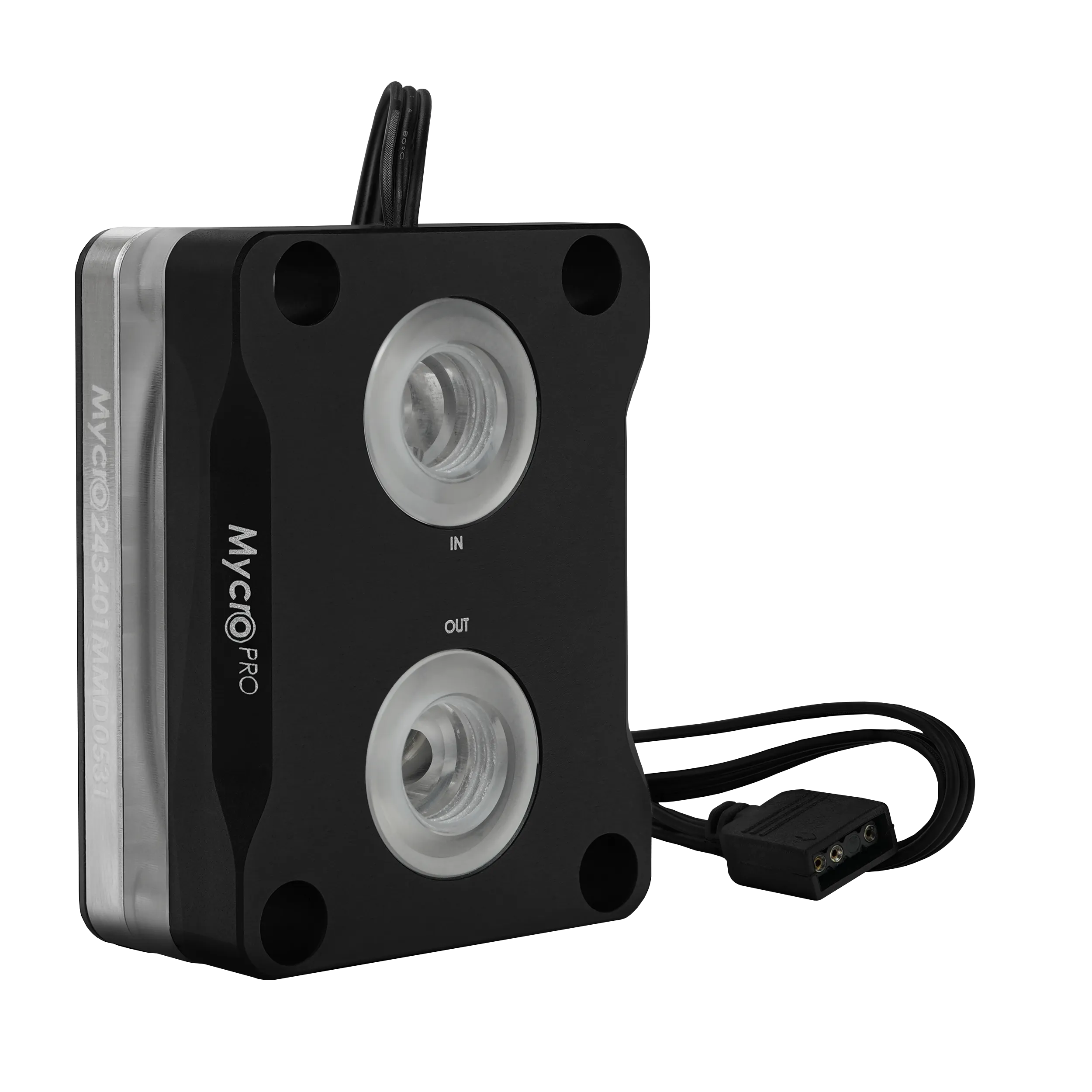 Entre la placa fría y la tapa de aluminio anodizado se encuentra acrílico, que se somete a un proceso de temple después del fresado para liberar las tensiones internas. Esto garantiza que, incluso después de un uso prolongado, no se formen grietas por tensión en el acrílico, como puede suceder con el acrílico templado. Debajo de la tapa de aluminio hay LEDs RGB, controlables a través de un conector ARGB de 3 pines (+5V/DATA/GND) en la placa base. Estos LEDs iluminan el acrílico bajo la tapa y las conexiones G1/4" en la tapa.