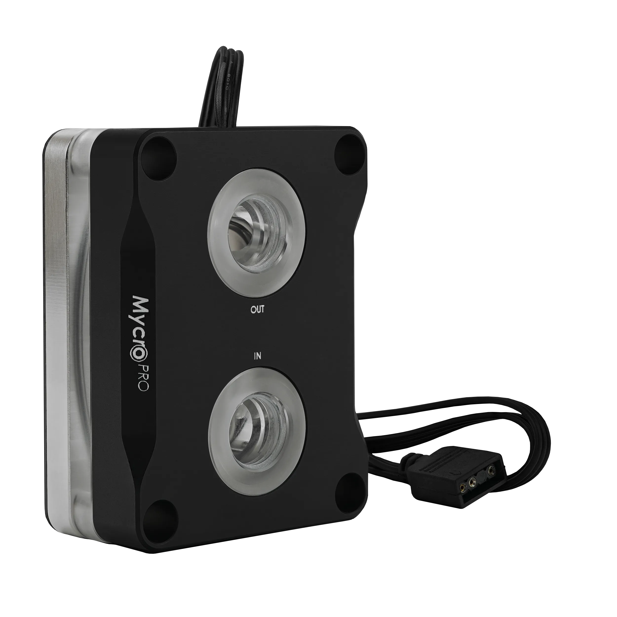 Los LED RGB están situados debajo de la cubierta de aluminio y se controlan mediante un conector ARGB de 3 pines (+5V/DATA/GND) a través de la placa base. Los LEDs iluminan el cristal acrílico bajo la cubierta y los conectores G1/4” situados en la misma.