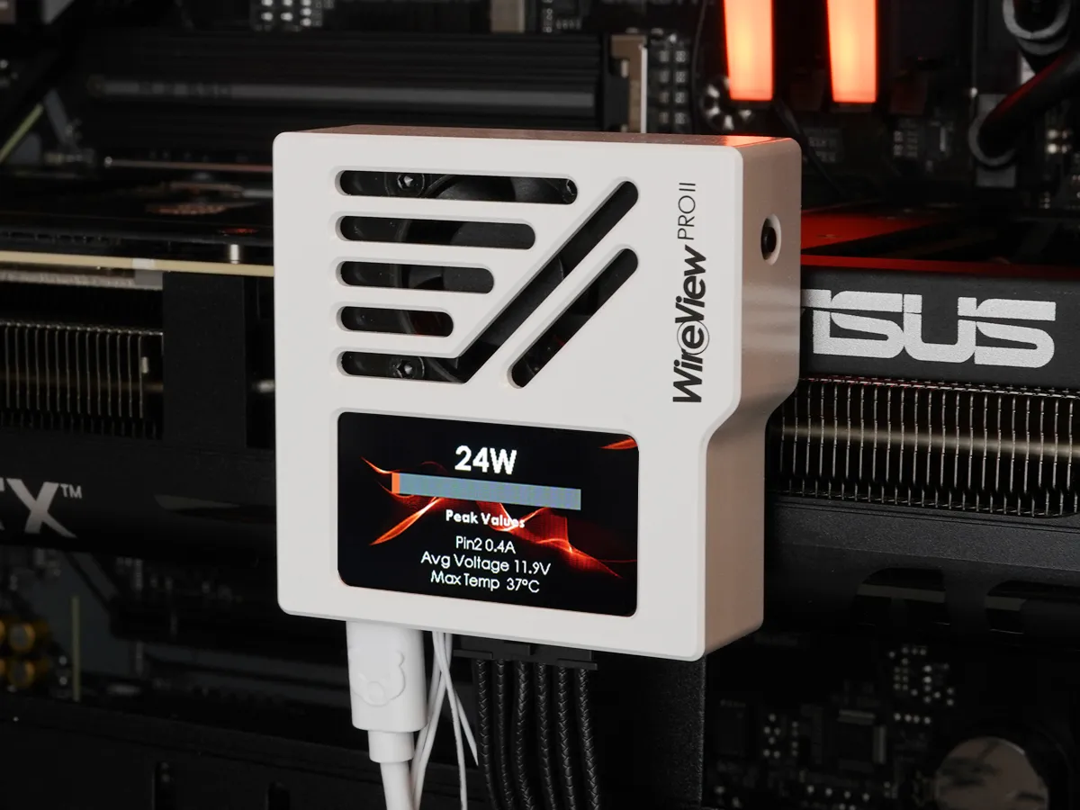 Das WireView Pro II ist in zwei Anschlussausrichtungen erhältlich und kann daher mit nahezu jeder Grafikkarte mit 12V-2x6-Anschluss eingesetzt werden. Die nach unten gerichtete Steckerorientierung ermöglicht eine saubere Kabelführung und das Gerät agiert somit gleichzeitig als 90°-Adapter. Auf dem integrierten TFT-IPS-Display stehen mehrere Ansichten zur Verfügung, die direkt am Gerät konfiguriert werden können. Das Gerät ist vollständig als Hardware-Lösung nutzbar und wird zusätzlich durch eine Software (WireView2-SW-1.0.3) ergänzt. Diese ist im Downloadbereich des Produktes verfügbar.